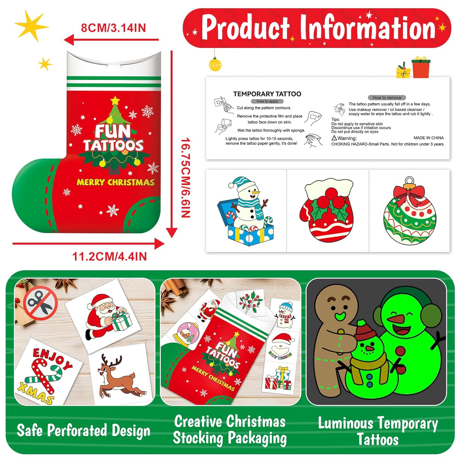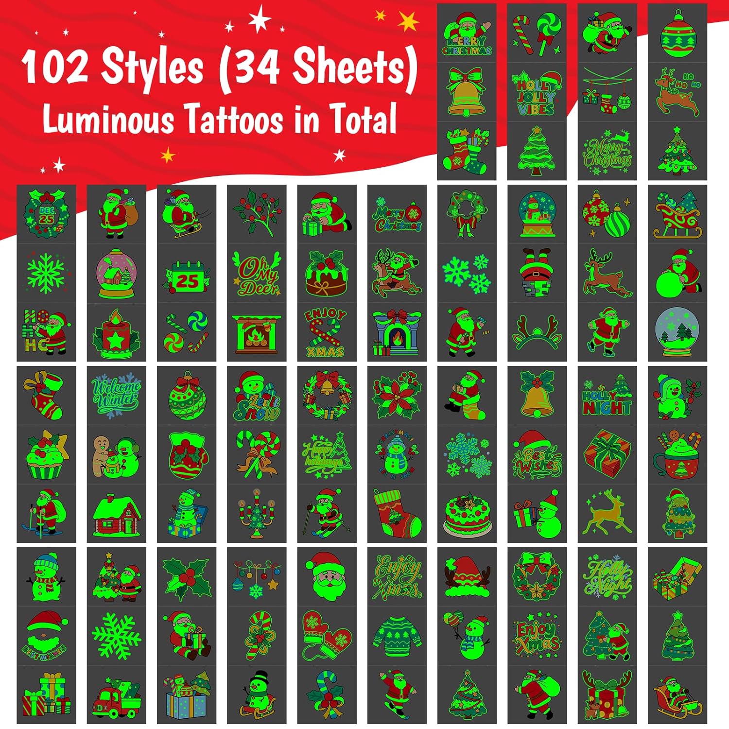 Add an extra sparkle to your holiday celebrations with these fun and festive Glow Temporary Tattoos. Featuring 102 unique designs, including snowmen, snowflakes, reindeer, Christmas trees, candy canes, bells, and more, these tattoos are the perfect addition to your Christmas festivities. They make fantastic stocking stuffers, are a hit at Christmas parties, and can even be used in class exchanges or family activities on Christmas Eve. Each tattoo is individually cut and wrapped for safe and easy distribution, making them a great choice for children and party guests.