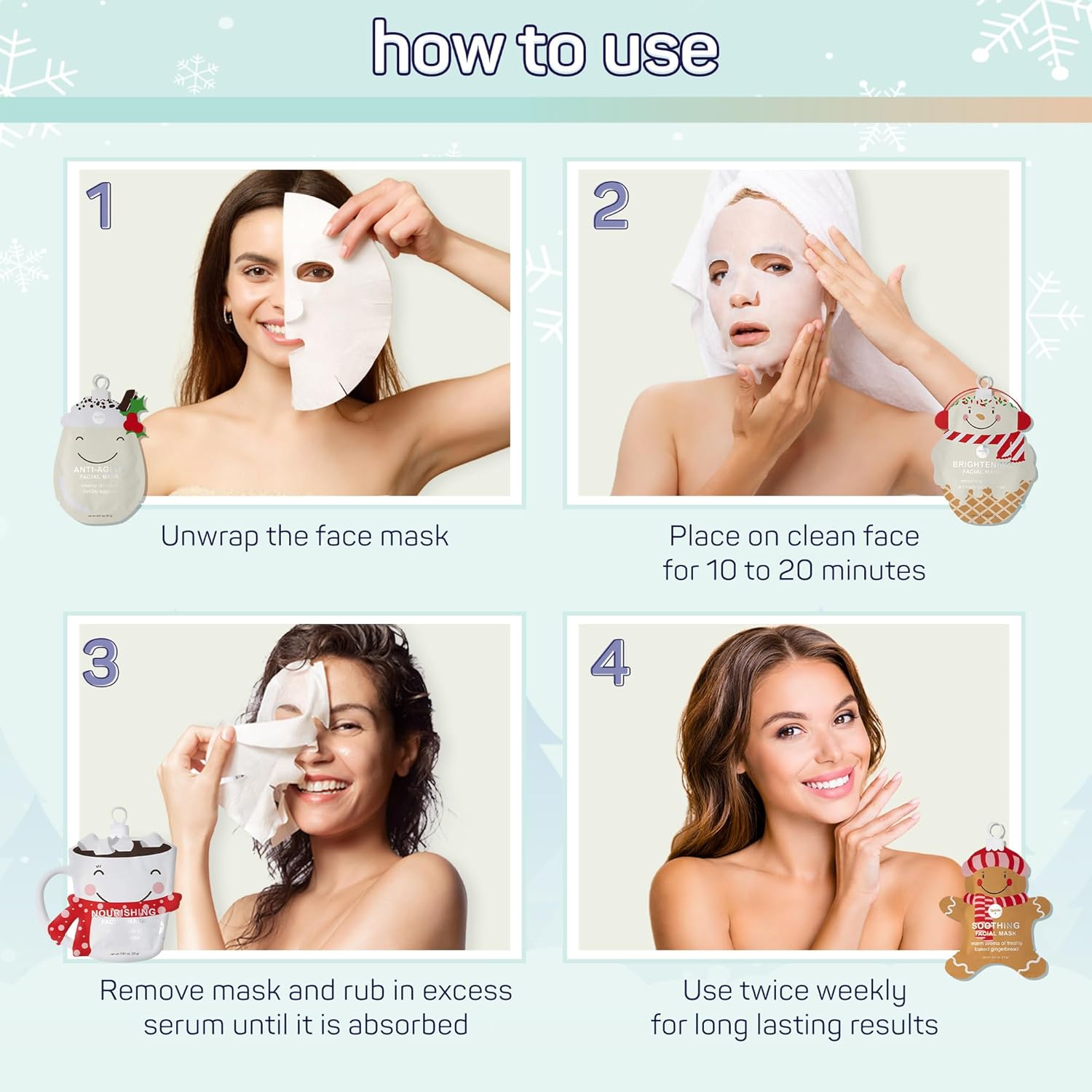 - Festive Holiday Designs: Includes themed masks featuring Gingerbread, Sundae, Cocoa, and Eggnog characters—perfect for holiday gifting or personal pampering.