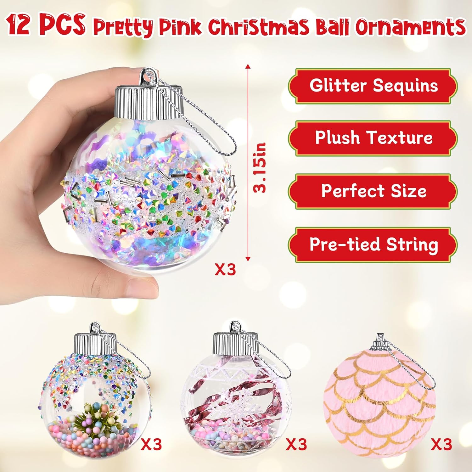 Add a touch of whimsical charm to your holiday décor with this set of Unique Pink Christmas Ornaments. Stepping away from traditional red and green, these ornaments feature a delightful combination of pink plush balls, clear balls adorned with glittering sequins, tiny decorative accents, and colorful ribbons. Designed to create a playful, candy-inspired Christmas vibe, these ornaments bring fresh, eye-catching textures and colors to your festive celebrations. Whether hanging on your tree, wreath, or garland, they add a soft, cheerful pop of color and charm.