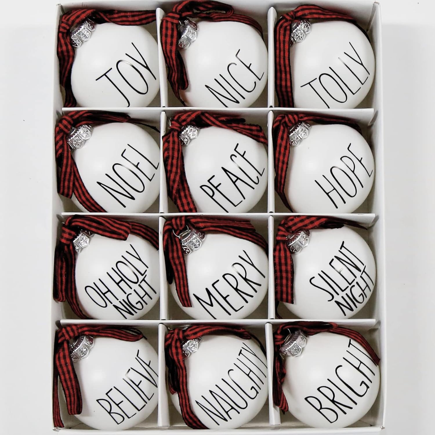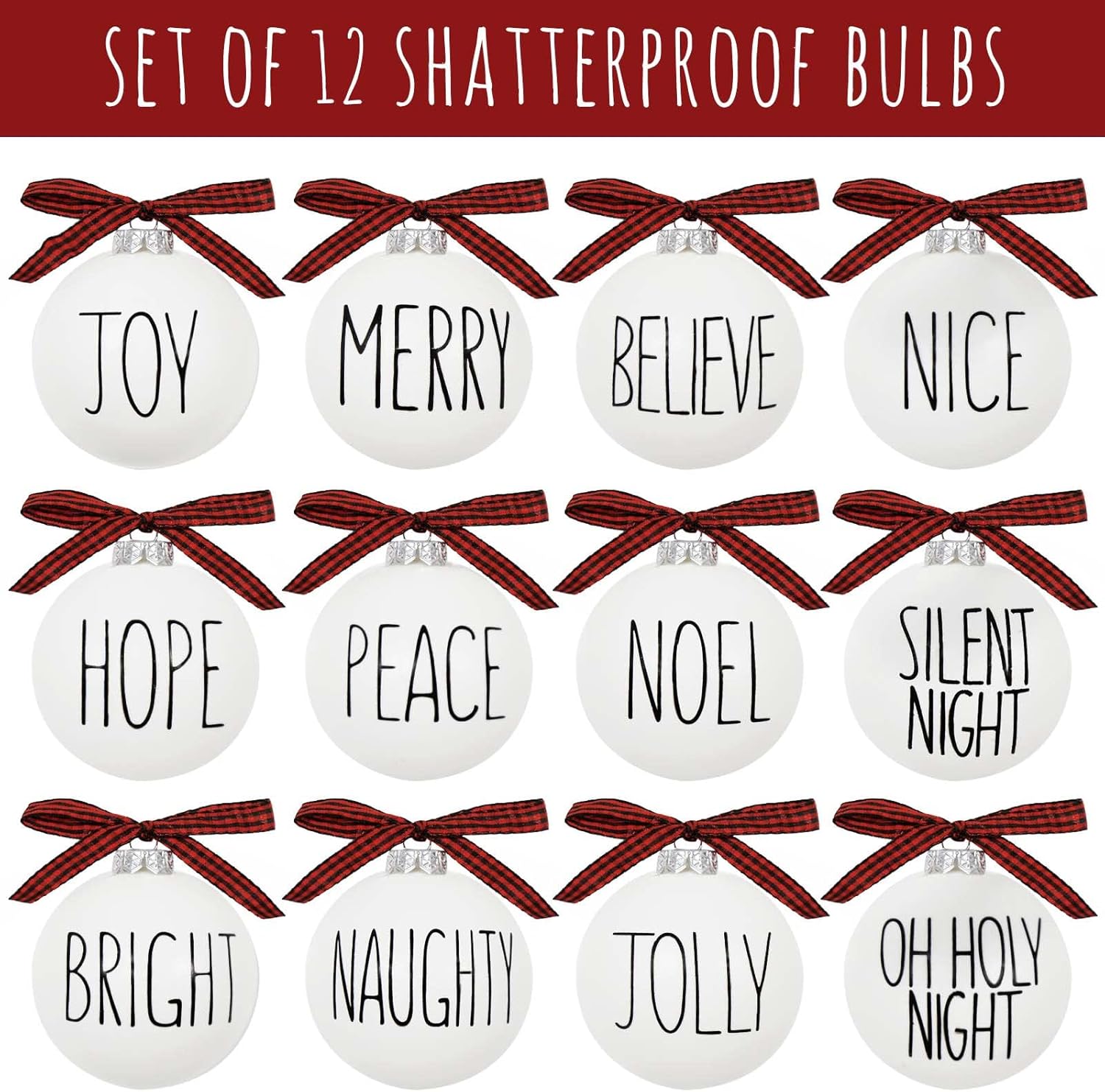 This charming set includes 12 Christmas balls, each measuring 2.36 inches in diameter, neatly packed in a 12-grid box for easy storage and gifting. Each white ornament is decorated with a classic buffalo plaid bow and rustic lettering, adding a cozy, farmhouse-style touch to your holiday tree. Designed to be incredibly lightweight, these balls hang effortlessly without weighing down your branches, making them perfect for any Christmas tree décor.
