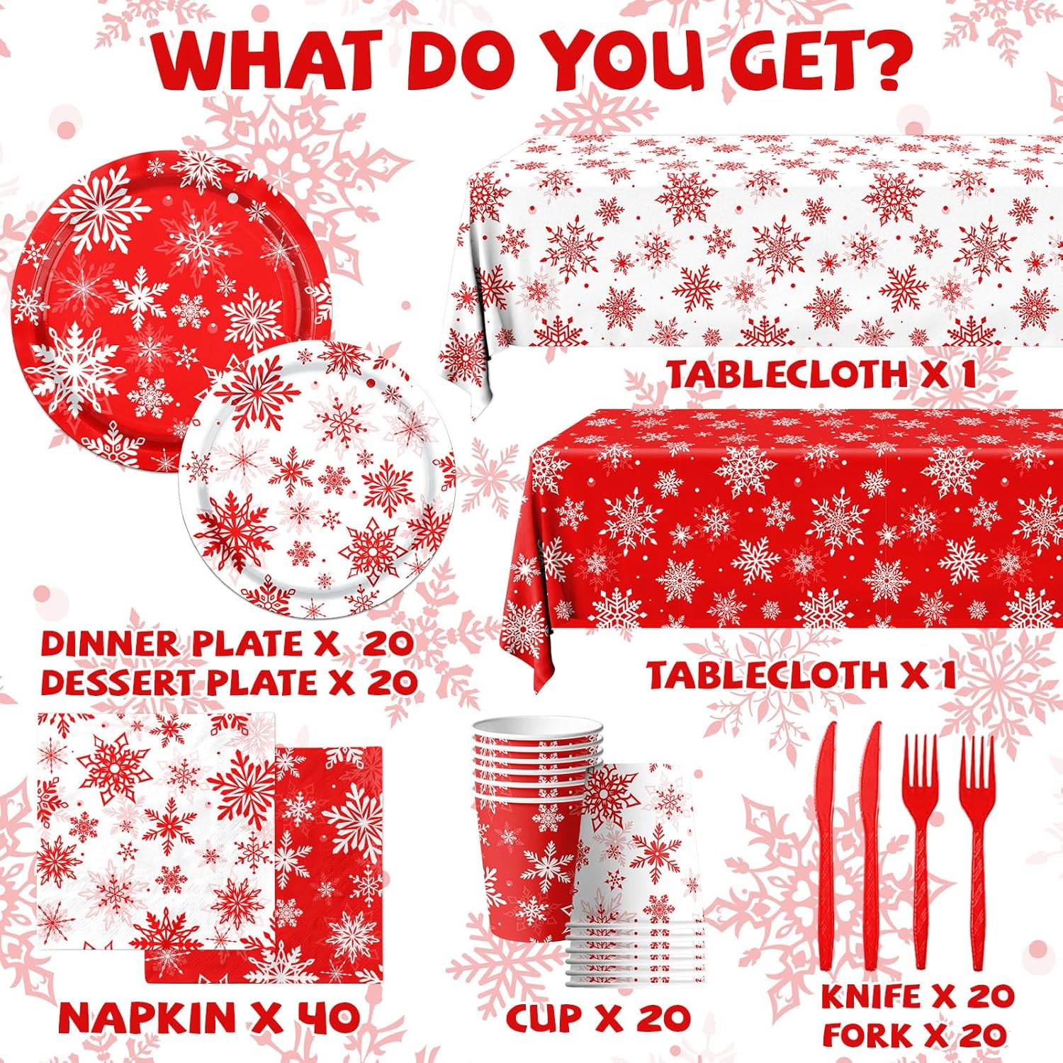 - Package Includes: 142 pieces (40 snowflake plates, 20 snowflake napkins, 20 snowflake cups, 2 snowflake tablecloths, 20 knives and forks)