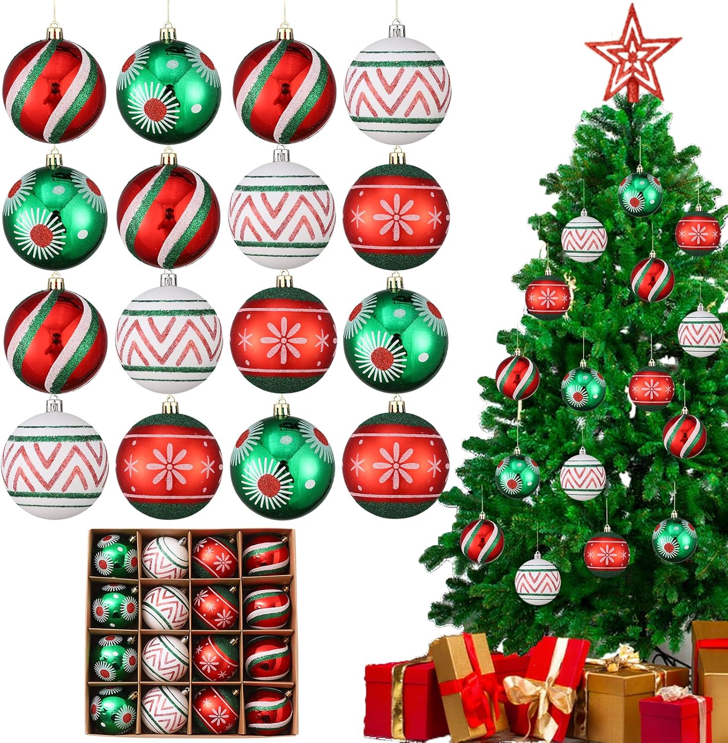 Elevate your Christmas décor with this beautifully crafted set of 16 Christmas ball ornaments. Featuring an array of shapes and vivid colors, these ornaments bring a burst of festive cheer and sophistication to your holiday setup. Each ornament is designed with classic Christmas patterns, such as snowflakes and stripes, capturing the spirit of the season. When hung on your Christmas tree, these ornaments transform it into a lively, unique centerpiece. The set is neatly packaged in a stylish box, making it easy to store and an ideal holiday gift.