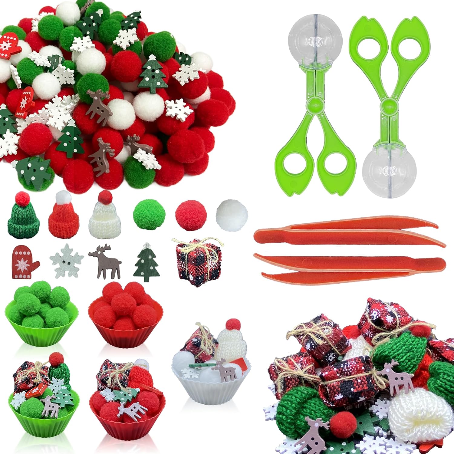 - Pieces Included: 176 pieces (pom poms, ornaments, hats, gift boxes, cups, tweezers, and scissors)
