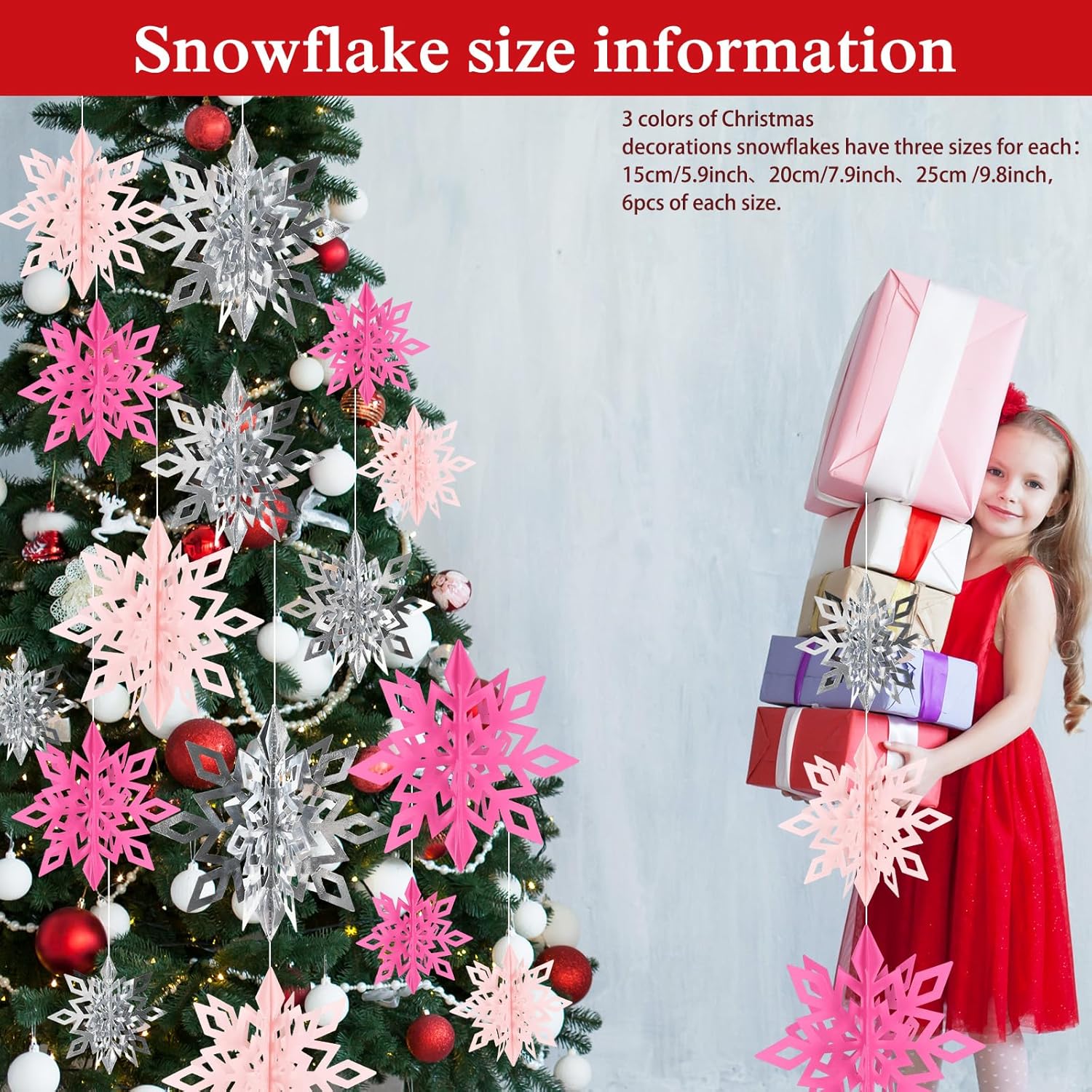 This Hanging Set is the perfect addition to your holiday décor. It includes 18 decorative pieces and 18 white strings, providing everything you need for an enchanting party or festive setting. Made from high-quality paper, these decorations are designed to be durable and reusable, ensuring they’ll last for multiple occasions. Each piece features an eye-catching 3D snowflake design, with a beautiful blend of silver, hot pink, and light pink colors, creating a charming and vibrant atmosphere. Whether for Christmas, winter celebrations, or other festive occasions, these decorations are sure to add a special touch to your celebrations.