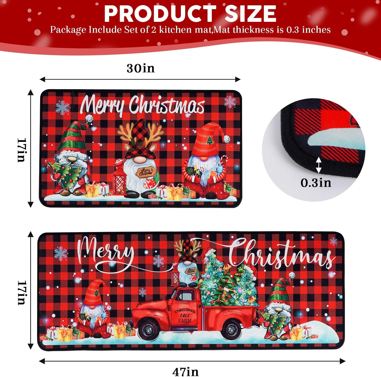 Enhance your kitchen’s festive cheer with this set of 2 Christmas rugs, designed for versatile placement and practical use. Measuring 17" x 30" and 17" x 47", these mats fit perfectly in front of your sink and stove to catch drips, spills, and crumbs while adding holiday spirit to your cooking space. Featuring a charming design with a playful Christmas gnome, a classic red truck, and a timeless red-and-black buffalo checkered background, these rugs bring warmth and joy to your kitchen décor. Made from high-quality, stain-resistant materials, they’re durable, super absorbent, and easy to clean—machine washable for convenience.