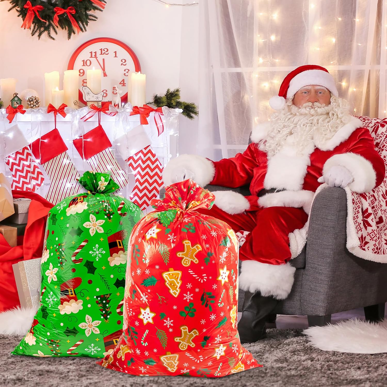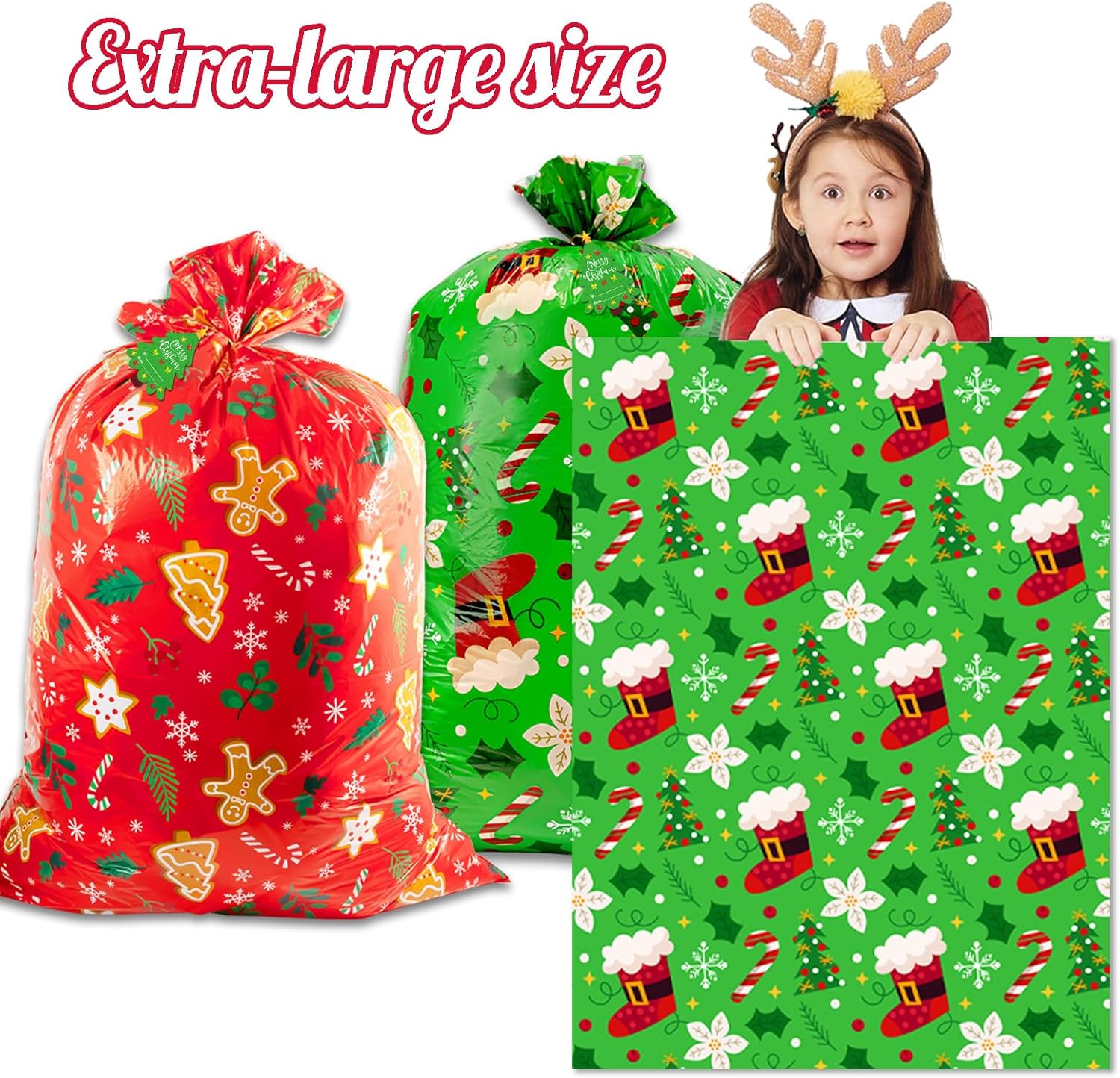Make your holiday gifting even more special with our 2-pack large Christmas gift bags. These jumbo bags are adorned with classic Christmas patterns like festive trees, gingerbread men, snowflakes, candy canes, and stockings. Their cheerful, vibrant designs add a fun, festive touch to your presents, ensuring they are as visually delightful as the gifts inside. With a generous size of 36" x 49", these large drawstring bags can easily hold all of your biggest holiday surprises—from oversized toys to winter clothing or festive treats. Simplify your holiday gift wrapping while making a big, joyful impression!