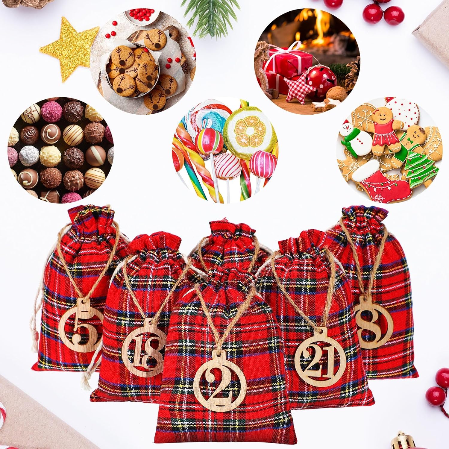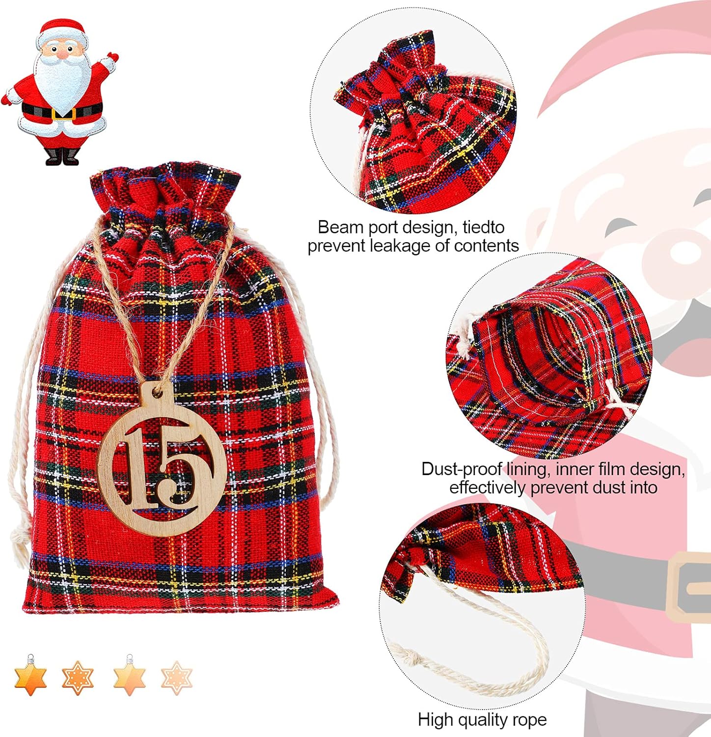 - 24 wooden countdown numbers and 24 buffalo check drawstring bags included