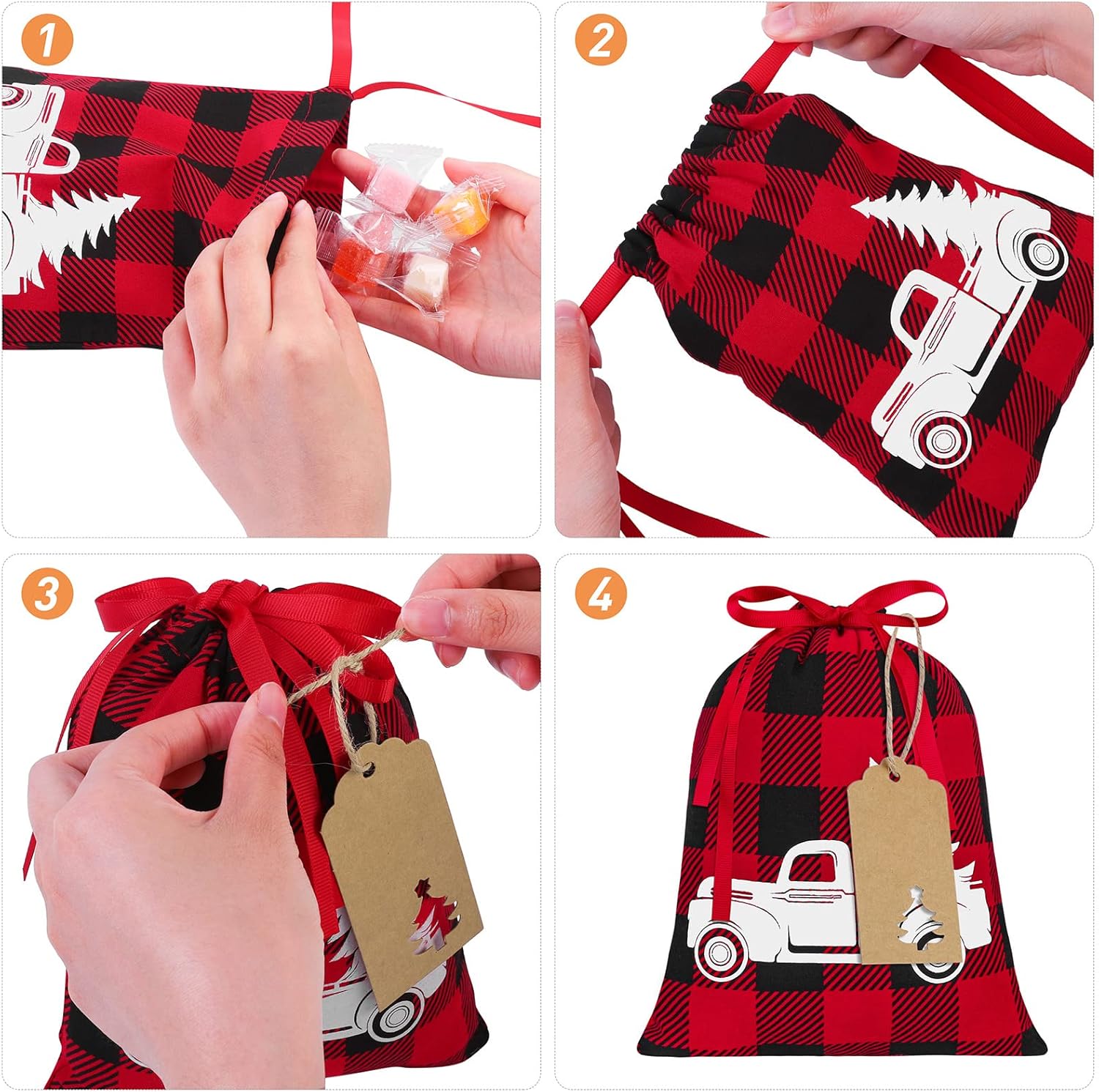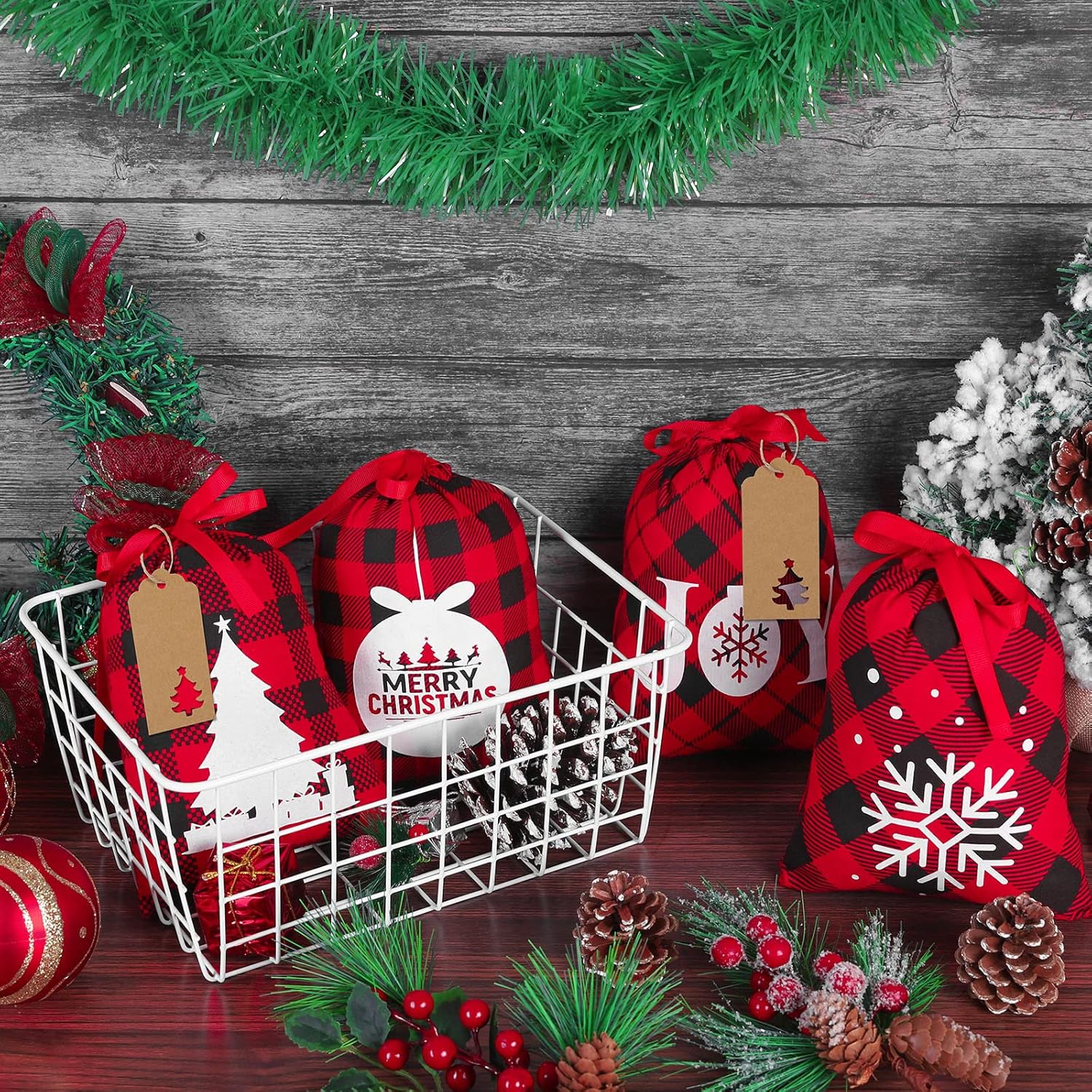 - 24 Buffalo Plaid Gift Bags: Set includes 6 different styles, each with a drawstring closure.