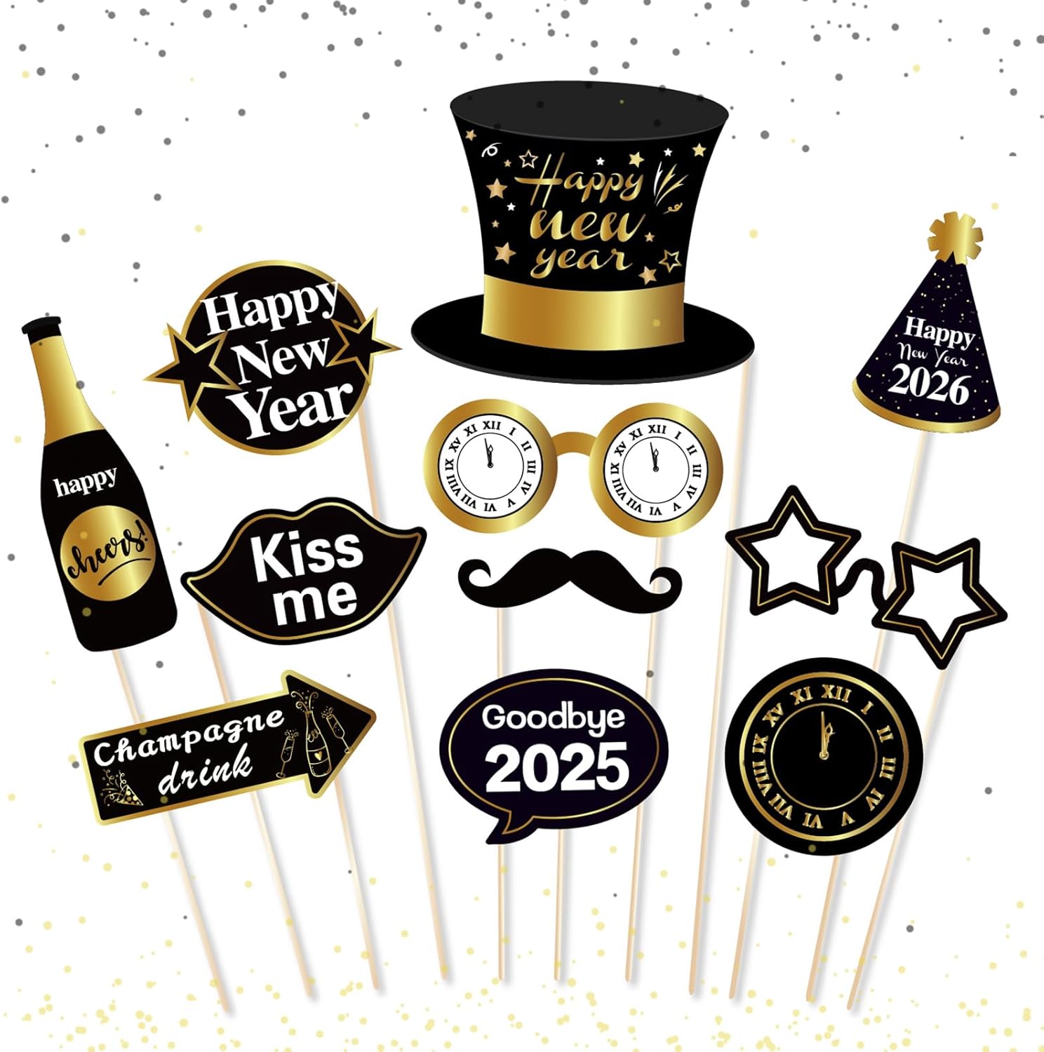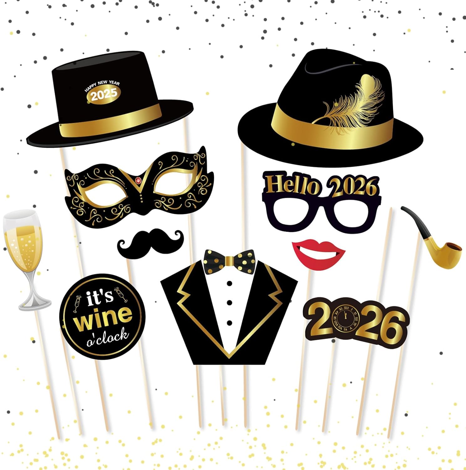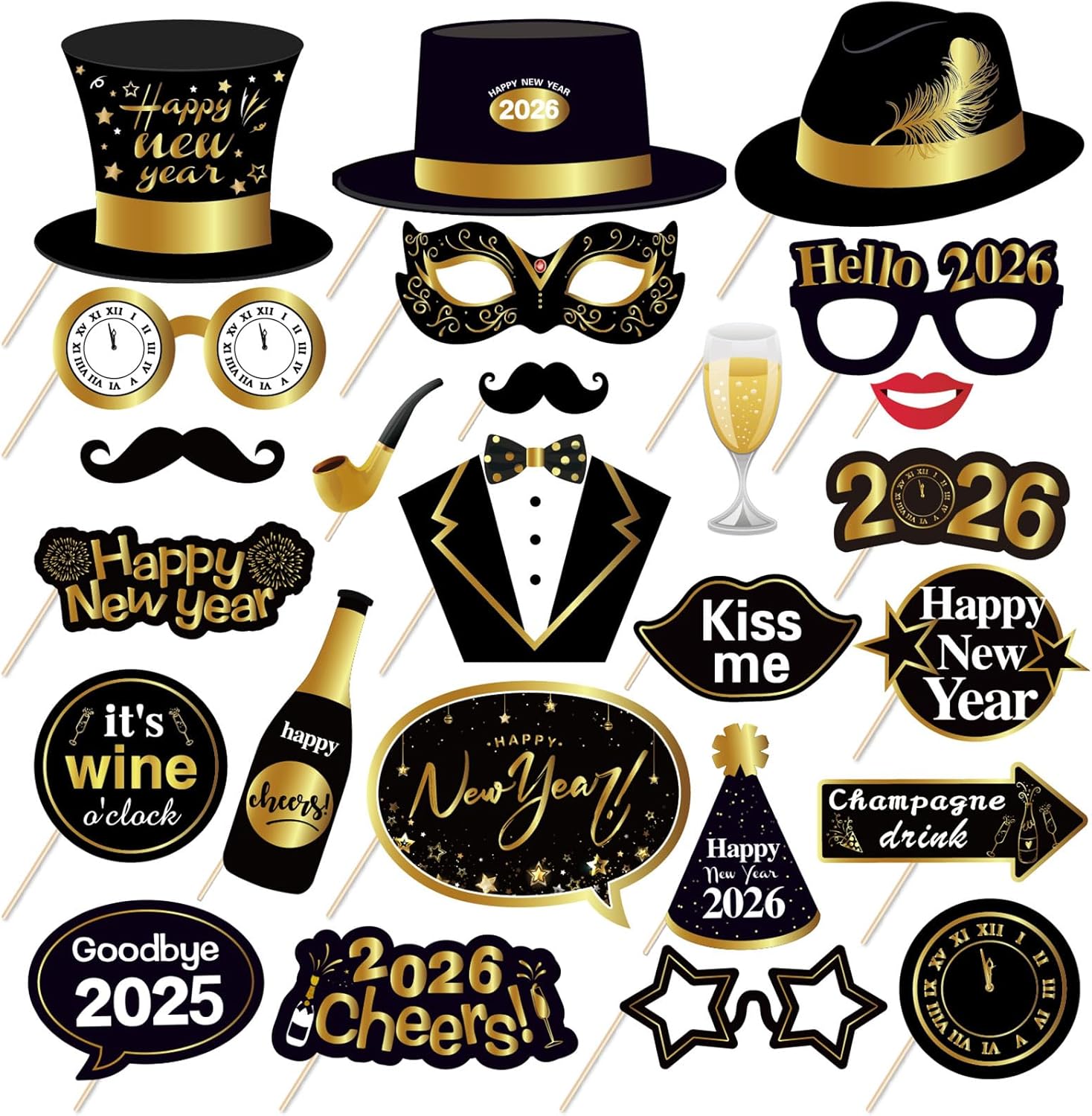 25 PCS New Year Photo Booth Props Black Gold Hats Glasses NYE 2026 Party