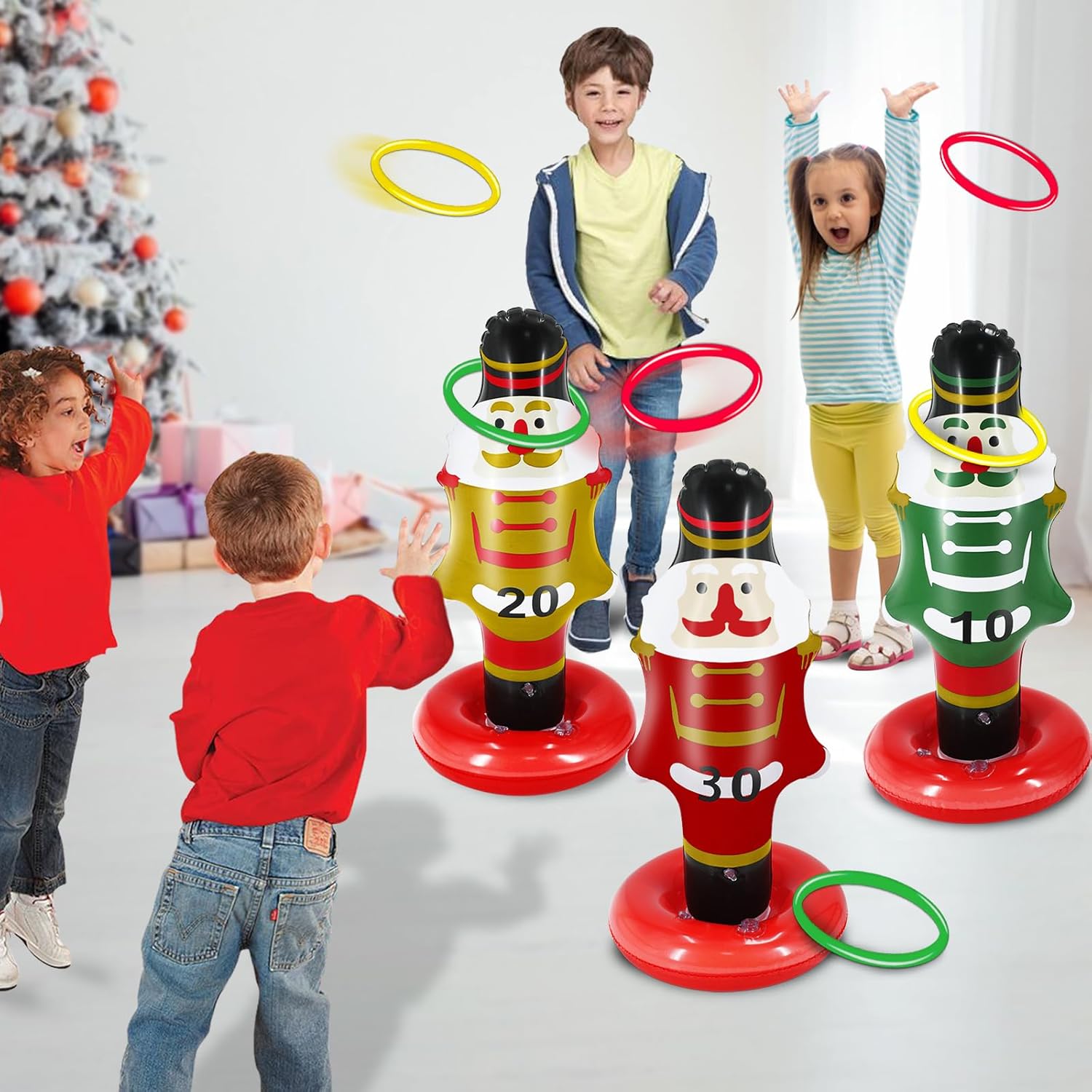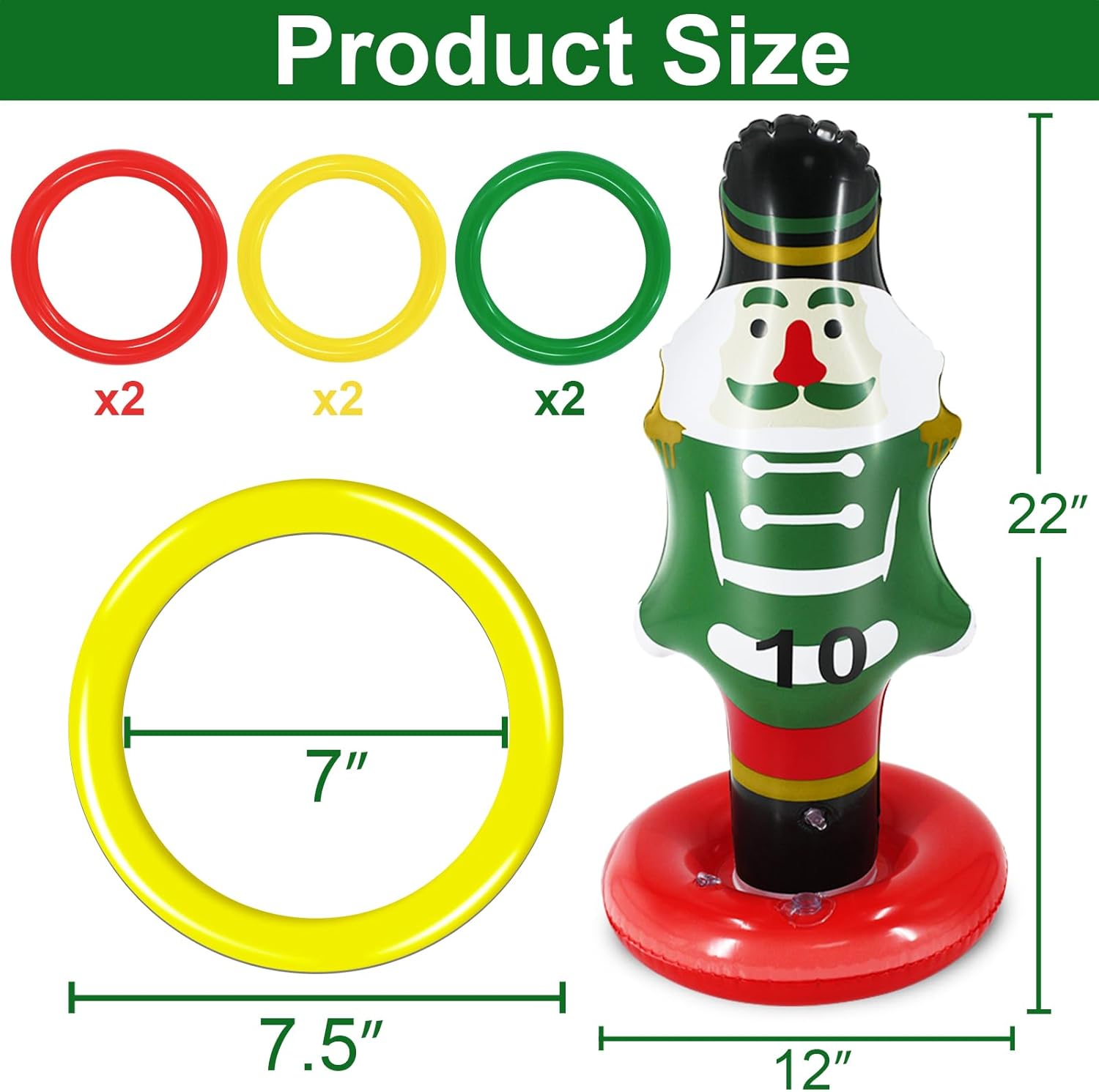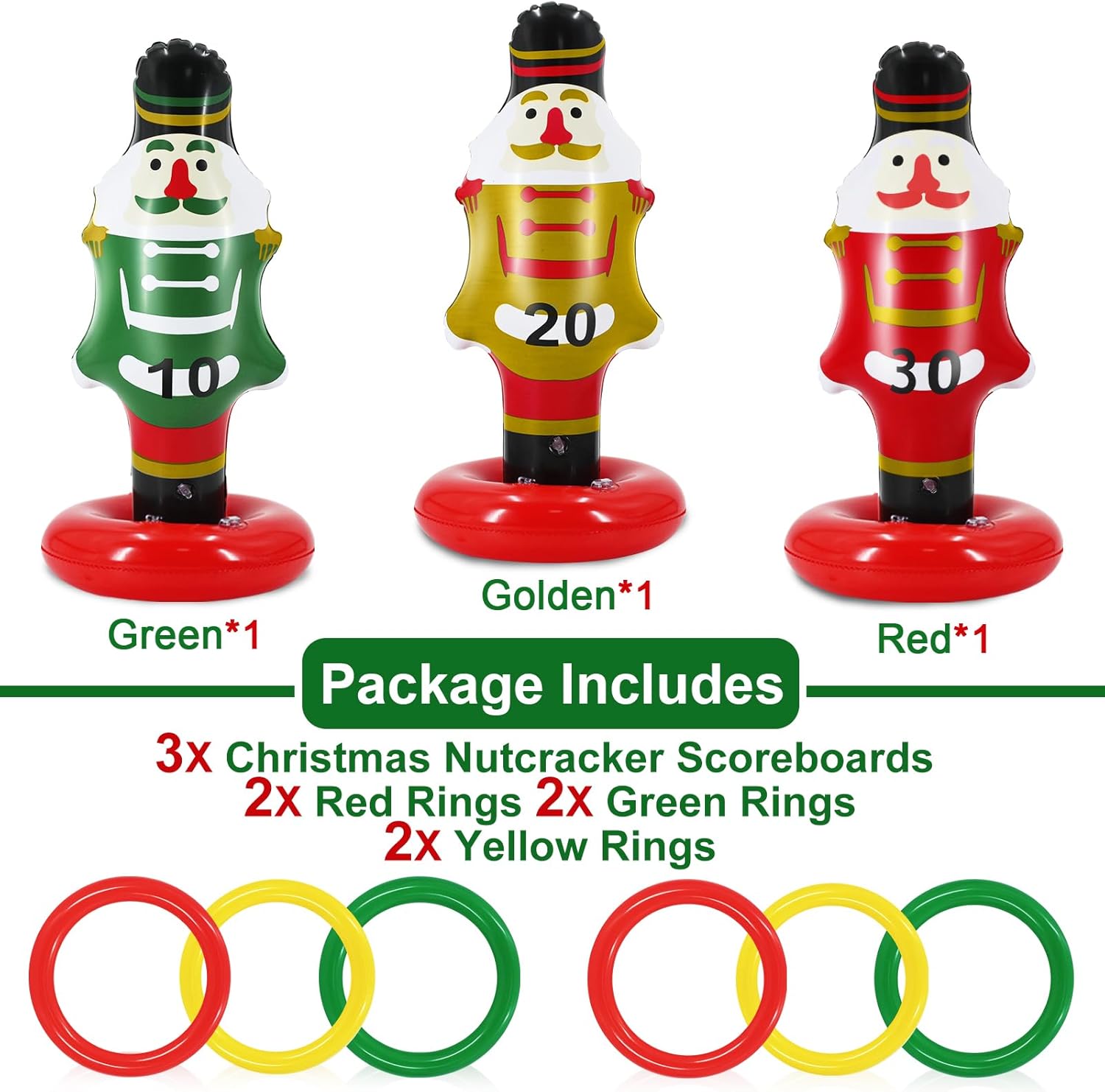 Make your holiday festivities even more fun with the 3 Pack Christmas Nutcracker Ring Toss Games! This festive game set includes 3 inflatable Nutcracker scoreboards in vibrant red, green, and gold, each measuring 22 x 12 inches (HxW). It also comes with 6 colorful plastic rings (2 red, 2 yellow, and 2 green), available in two sizes—11.5 inches (large) and 7.5 inches (small). Each Nutcracker scoreboard is printed with a different goal: 10 points (green), 20 points (golden), and 30 points (red), adding a competitive twist to your holiday parties. Perfect for family gatherings, Christmas games, or just spreading holiday cheer!