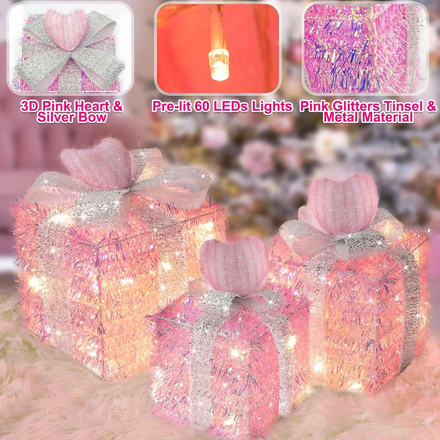 Add a touch of romance and sparkle to your holiday decor with this 3-Pack of Pink Light-Up Gift Boxes. Perfect for Christmas, Valentine's Day, or weddings, these beautifully designed gift boxes come in three sizes—super large, large, and medium—each adorned with 60 warm LED lights. The pink tinsel glitter and silver accents, along with the 3D pink heart-shaped decor, create a charming, festive atmosphere that will brighten up any space. With 8 lighting modes, you can easily adjust the glow to suit your mood and the occasion.