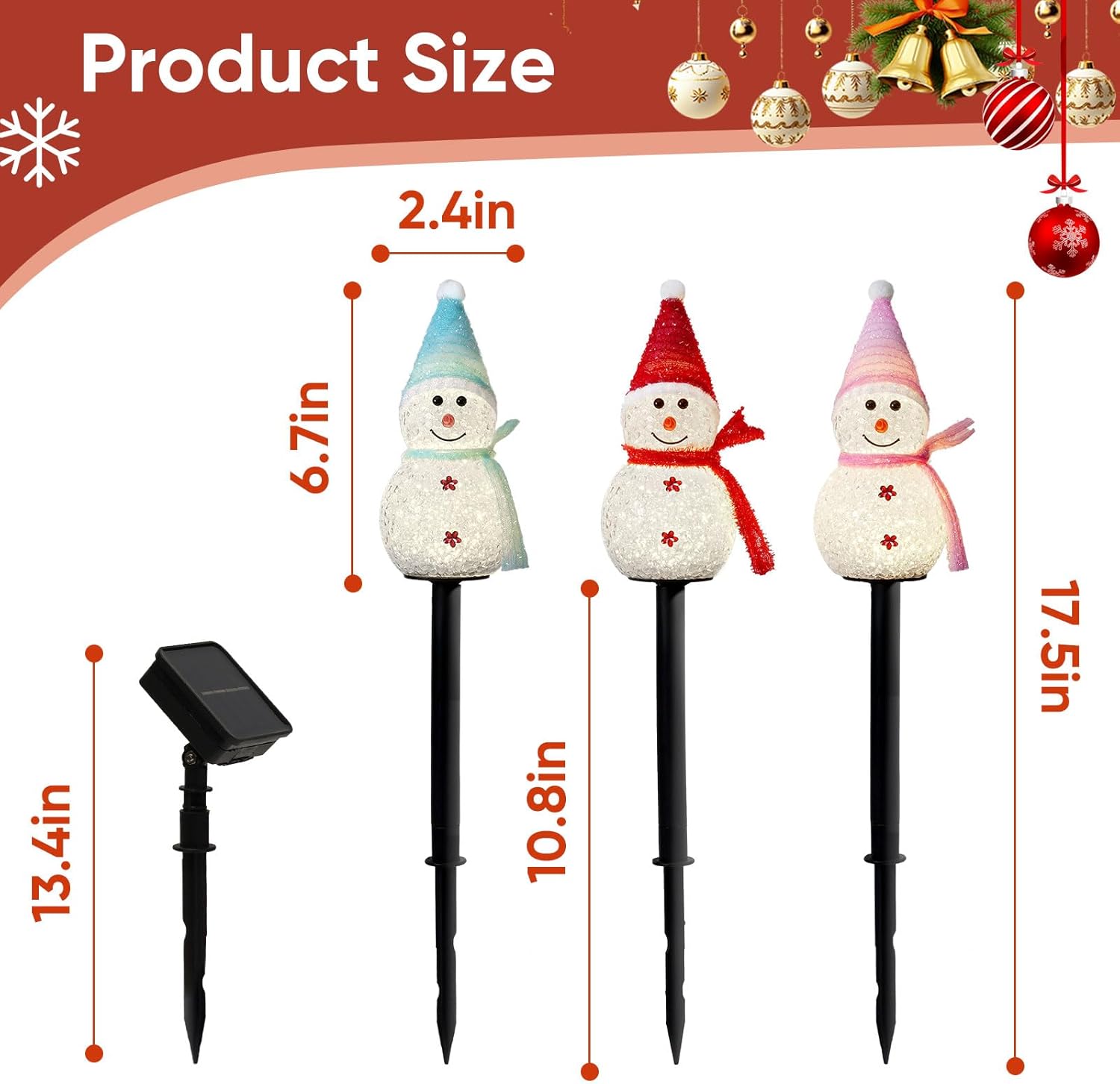 - Ground stakes included: 4 (1 for solar panel, 3 for snowmen)