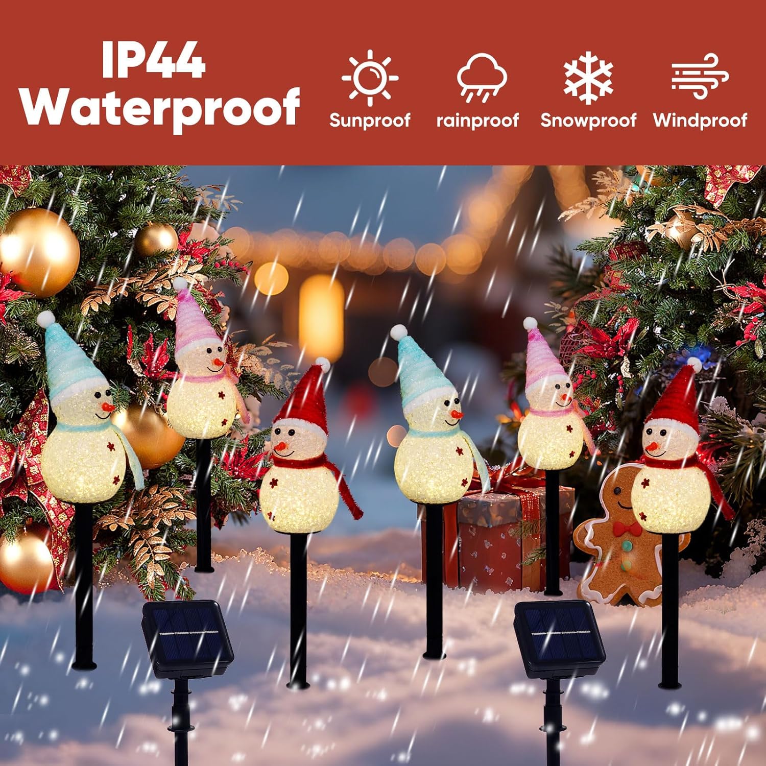 - Set of 3 solar-powered snowman lights with festive hats and scarves
