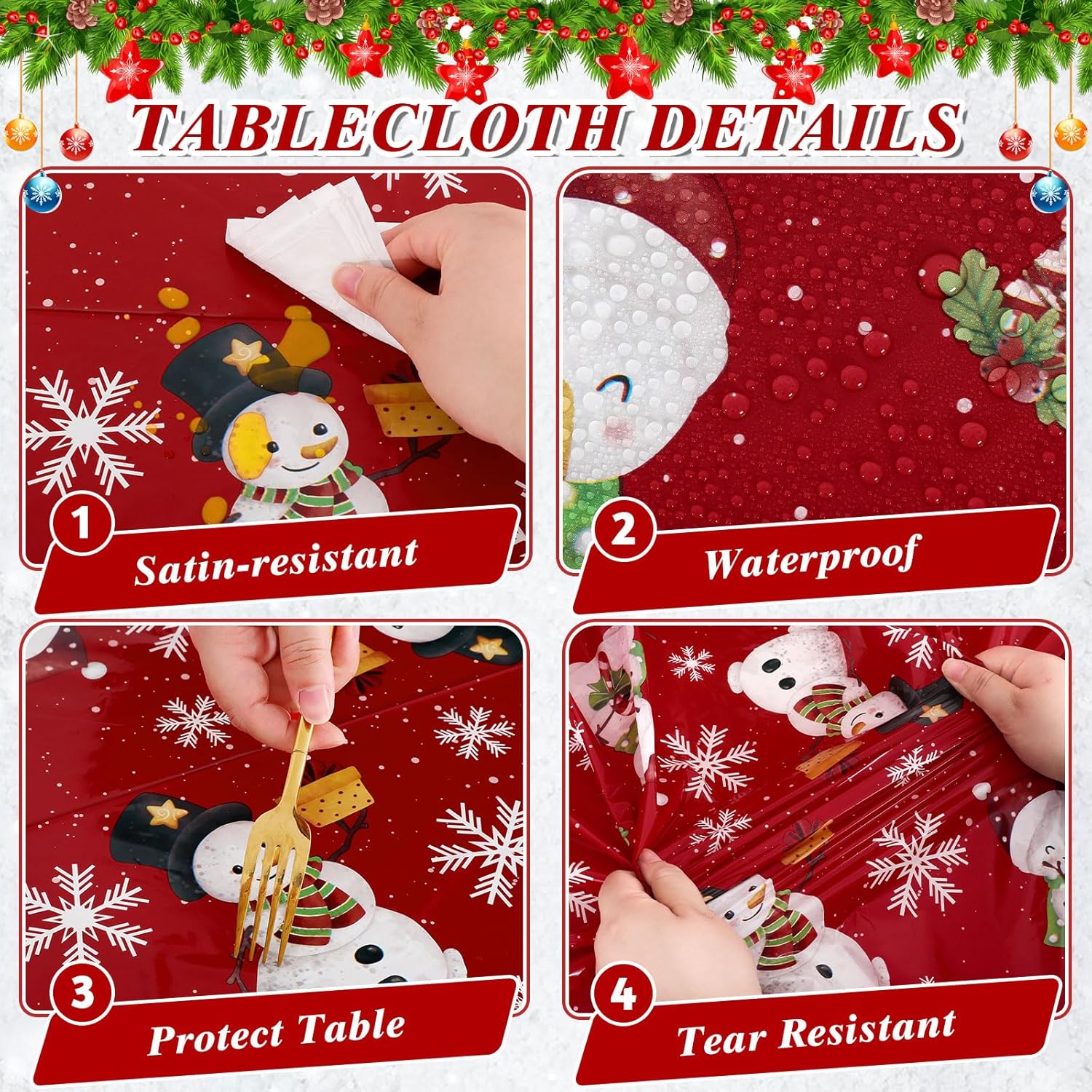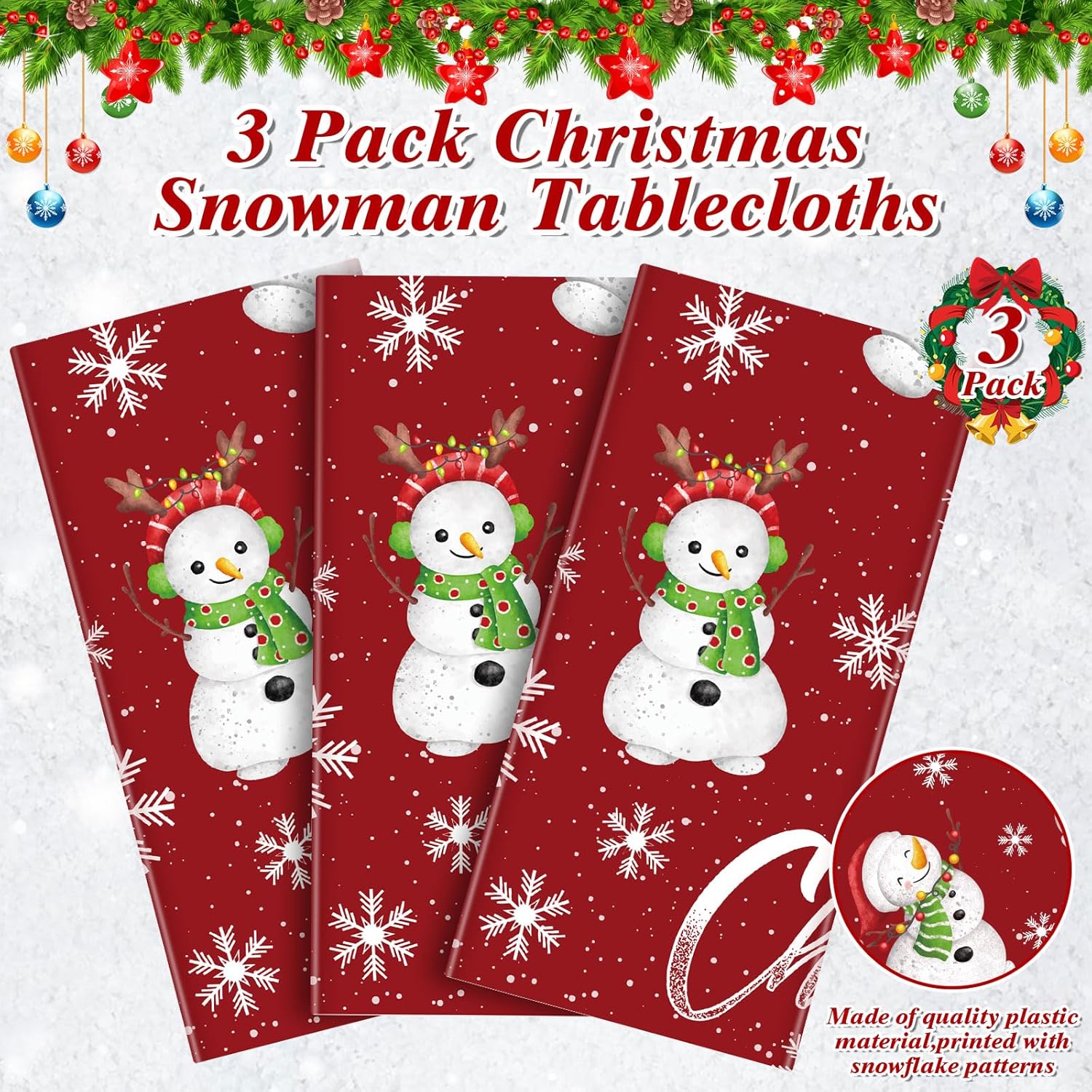 - Festive Snowman Design: Featuring a cheerful snowman pattern, this tablecloth adds a festive, wintry charm to your dining space, perfect for Christmas meals and family celebrations.