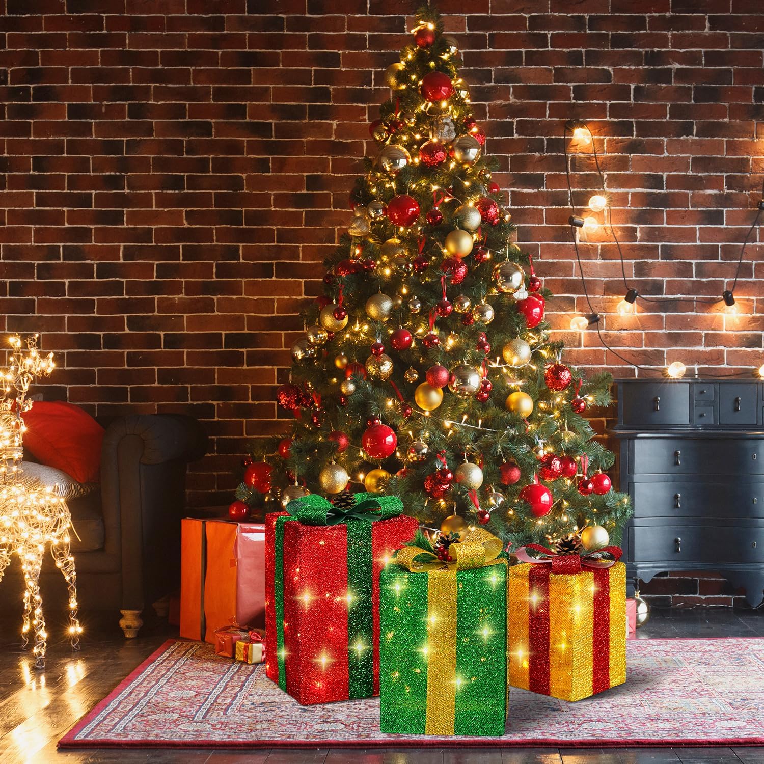 - Set Includes: 3 lighted Christmas gift boxes in red, green, and gold