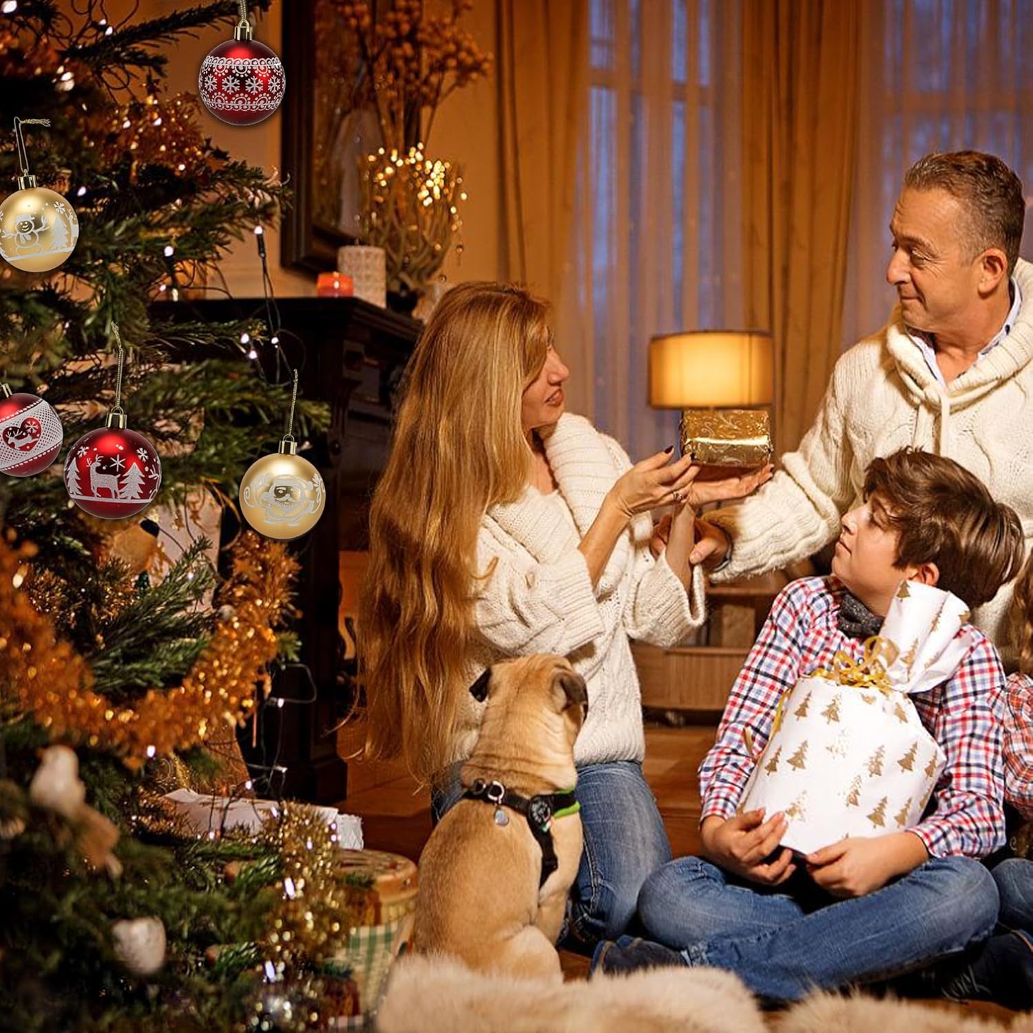 These classic Christmas balls bring timeless charm to your holiday décor. Designed in a beautiful mix of gold and red, each ornament features unique designs such as Christmas Snowmen, Elk, Snowflakes, and Santa, adding a festive touch to your Christmas tree or home. These ornaments are perfect for creating a warm and joyful Christmas atmosphere, helping you and your family make lasting holiday memories. The 2.36-inch size is ideal for easy hanging, and they come with a see-through box, string, and hook for immediate display. Crafted from durable, eco-friendly plastic, these ornaments are drop-resistant, making them safe for homes with pets and children.