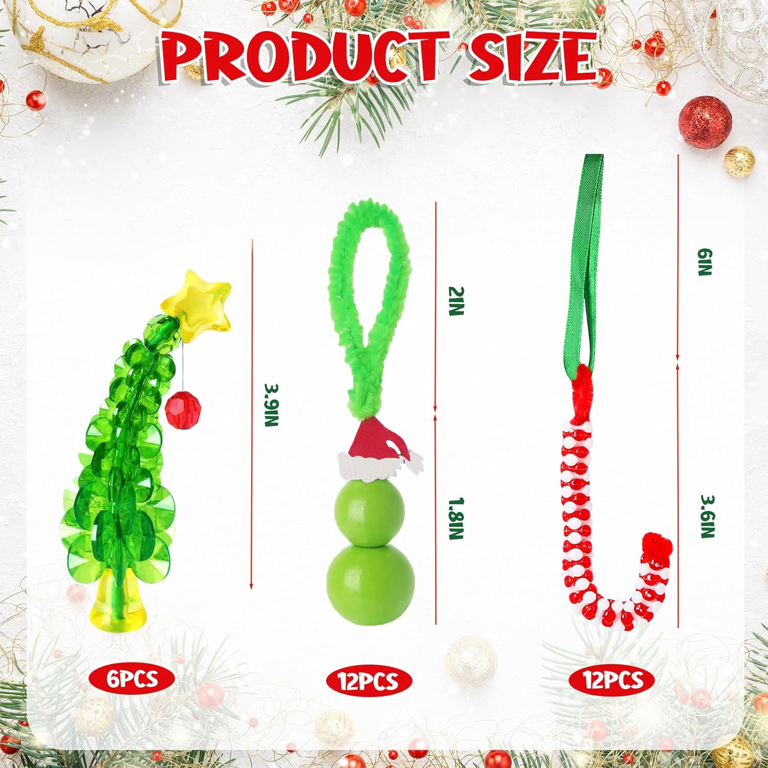 - Includes 6 beaded Christmas trees, 12 candy cane decorations, and 12 green ball ornaments with Santa hats