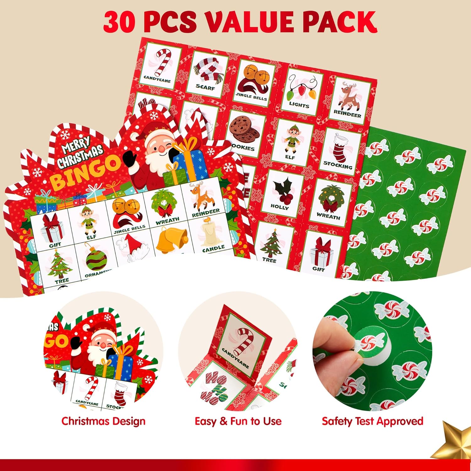 - Complete set includes 30 bingo cards, 1 callout card, and 8 marker sheets