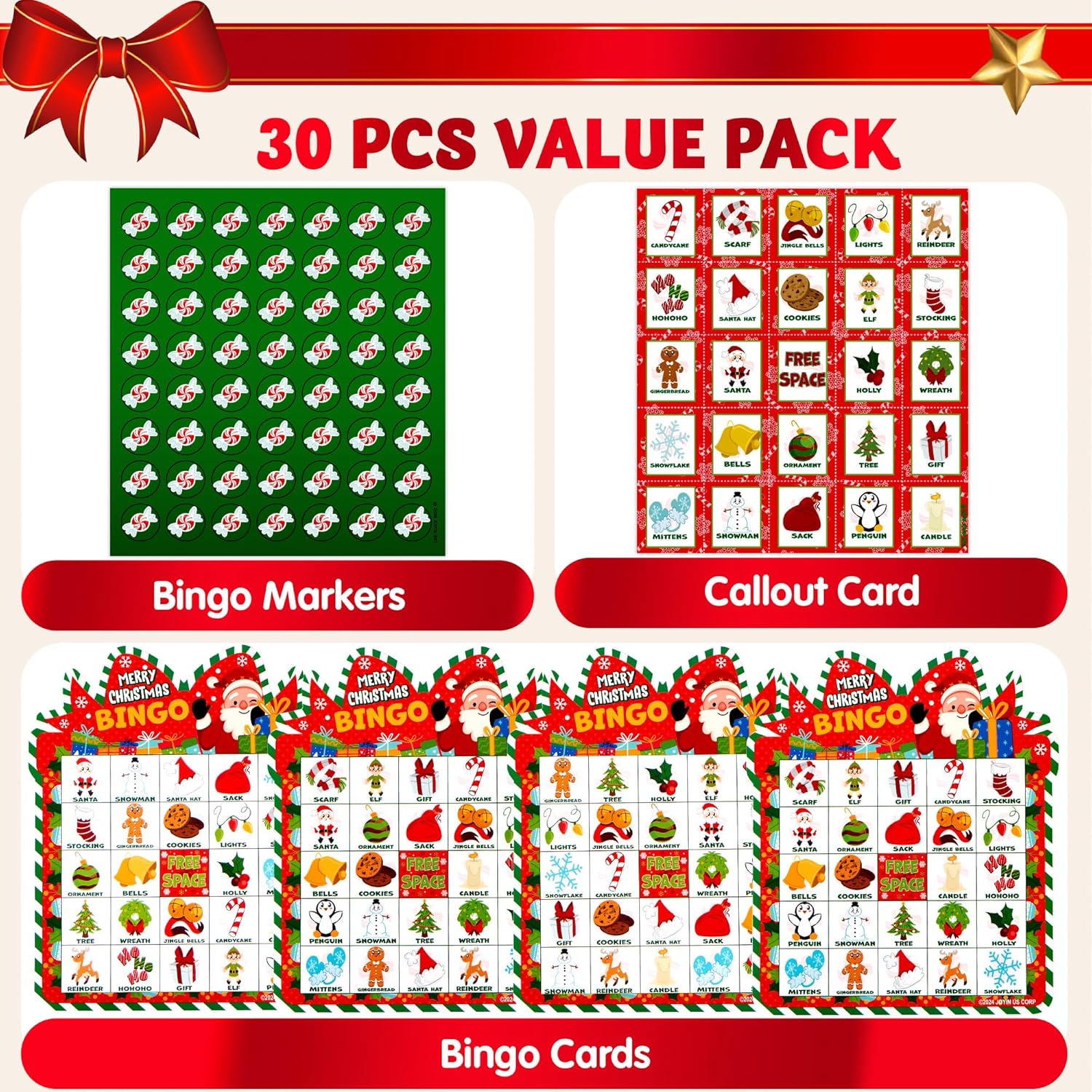 - Quantity: 30 bingo cards, 1 callout card, 8 marker sheets