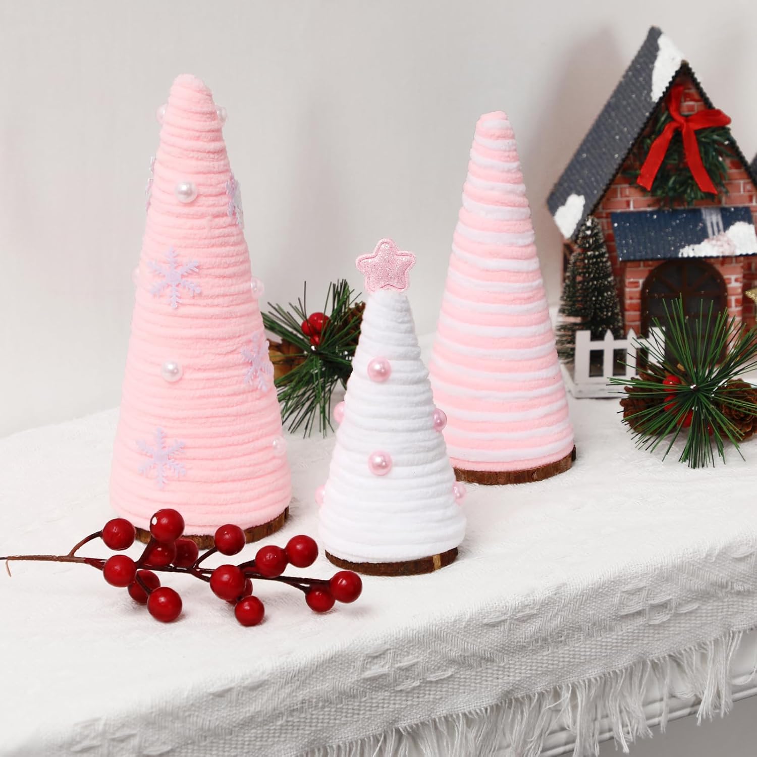 Add a cozy and charming touch to your holiday décor with this set of 3 Christmas yarn tree decorations. Each tree, handcrafted with quality pink and white yarn, brings a warm and festive spirit to your home. Adorned with delicate snowflake ornaments and shining beads, these trees radiate joy and sweetness, perfectly capturing the magic of the Christmas season. Their varying sizes create an appealing visual depth, making them a delightful addition to any room.