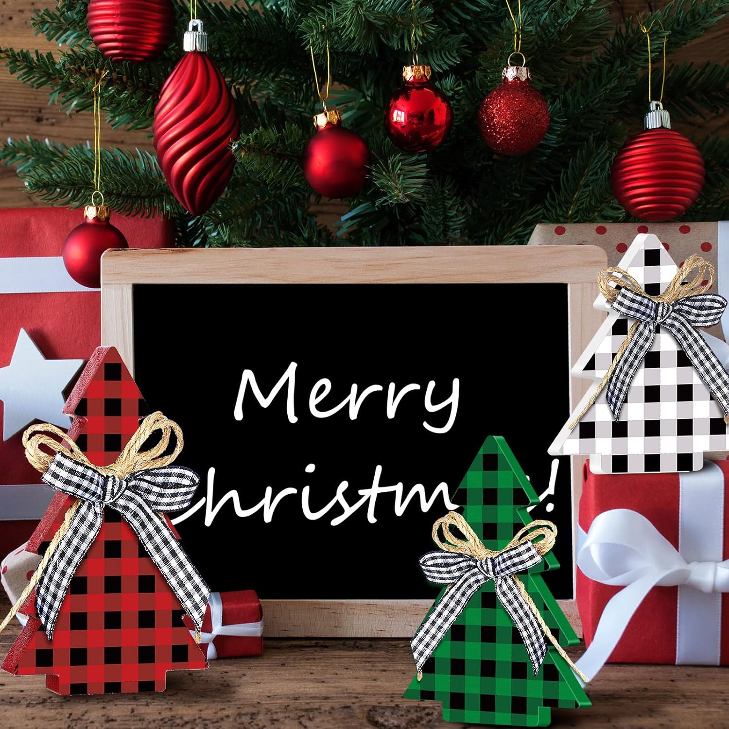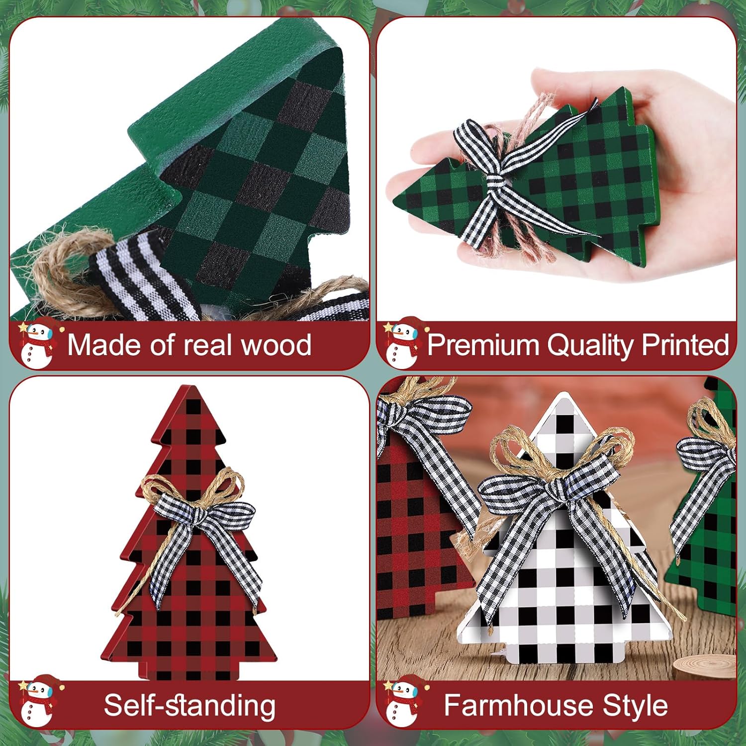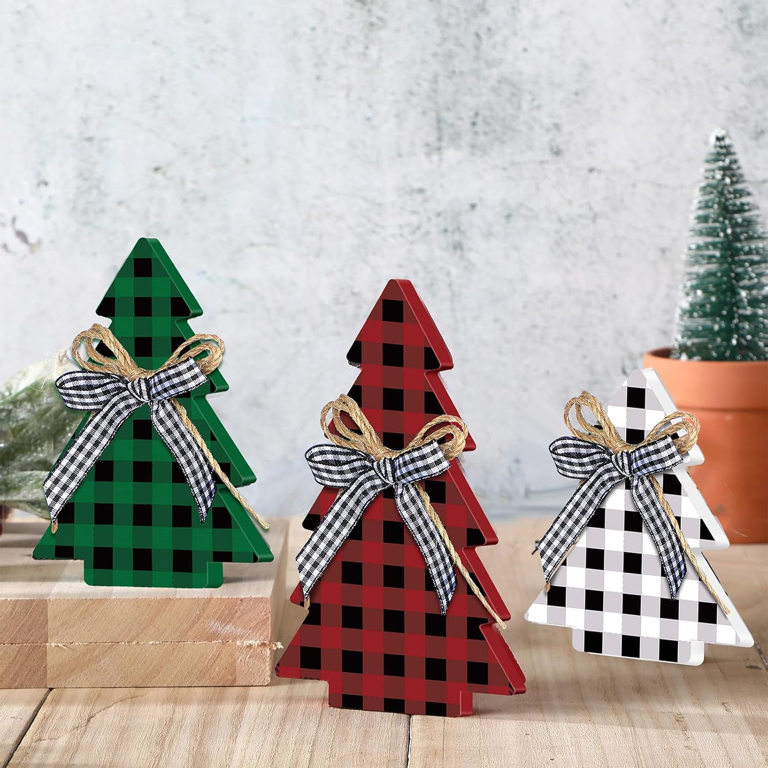 3PCS Rustic Wooden Christmas Tree Table Decor Farmhouse Buffalo Plaid