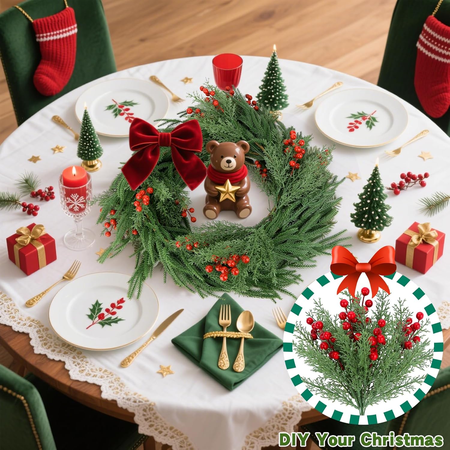 - Lifelike red berries and pine needle sprigs for a festive, natural look
