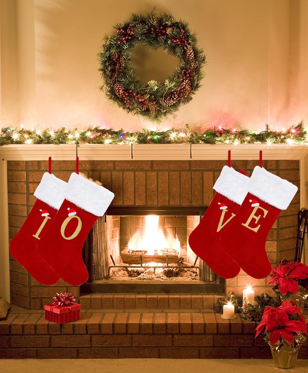 - Festive & Elegant Design: Includes four stockings with different styles, such as the charming red velvet design with LOVE letters, and other delightful patterns, each adorned with furry decorations that add texture and warmth.