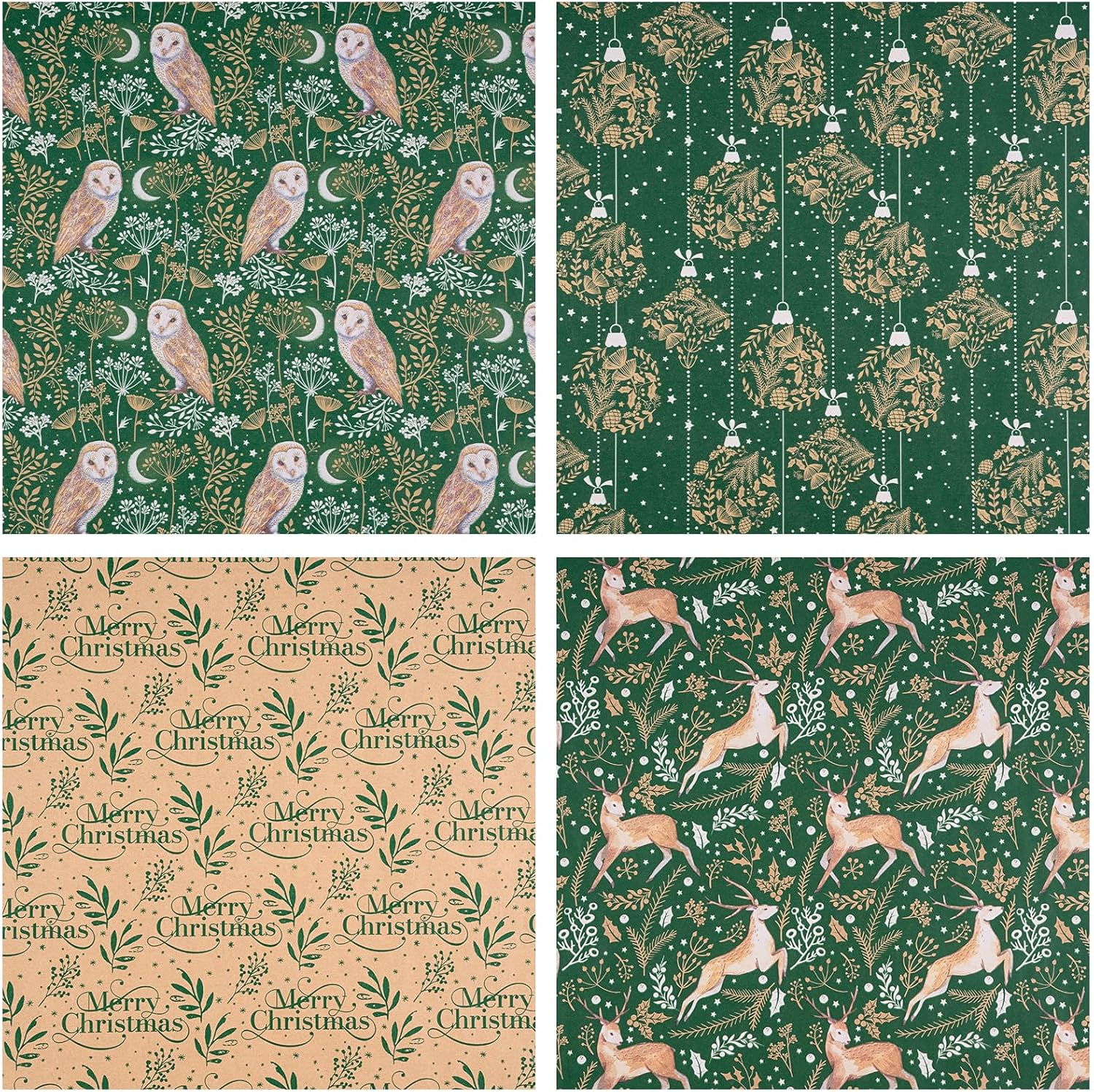 Add a charming holiday touch to your gifts with this Christmas Kraft Wrapping Paper Set. Featuring four unique festive designs—including a green owl, reindeer, Christmas ball, and cheerful Christmas greetings—these rolls bring warmth and style to any present. Each roll measures 30 inches by 10 feet, providing plenty of wrapping paper to cover all your holiday gifting needs. Made from high-quality, recyclable kraft paper, this eco-friendly set not only looks great but also supports sustainable choices. The reverse side includes a handy grid cutting line for easy and precise gift wrapping.