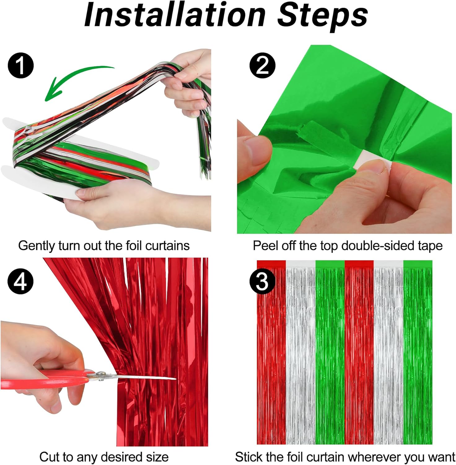 4-Piece Christmas Curtain Set, 3.28 FT x 7.05 FT Metallic Foil Red, Silver & Green Fringe