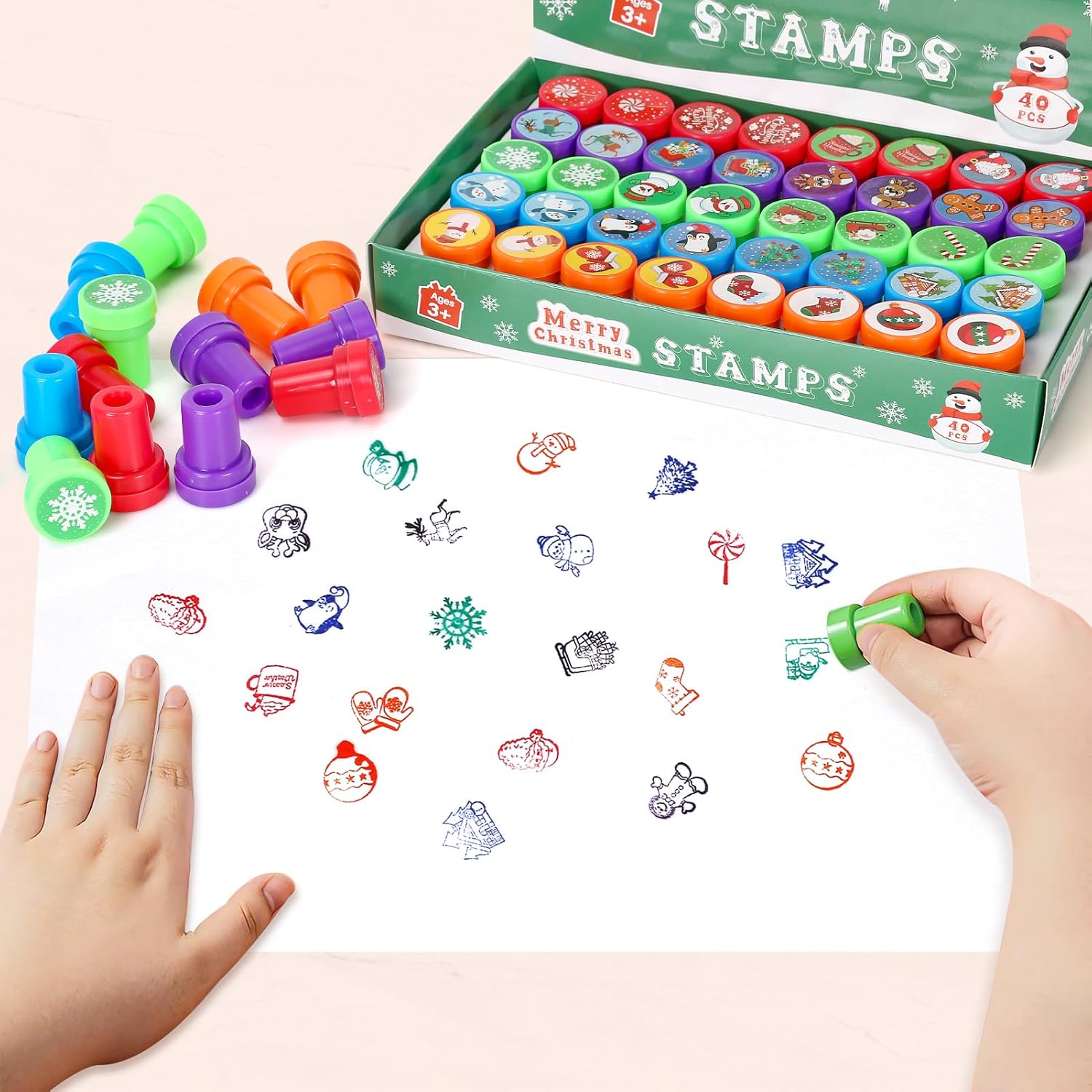 - 40 Christmas Stamps: Includes 40 pre-inked mini stampers with 20 different Christmas-themed designs (2 of each design).