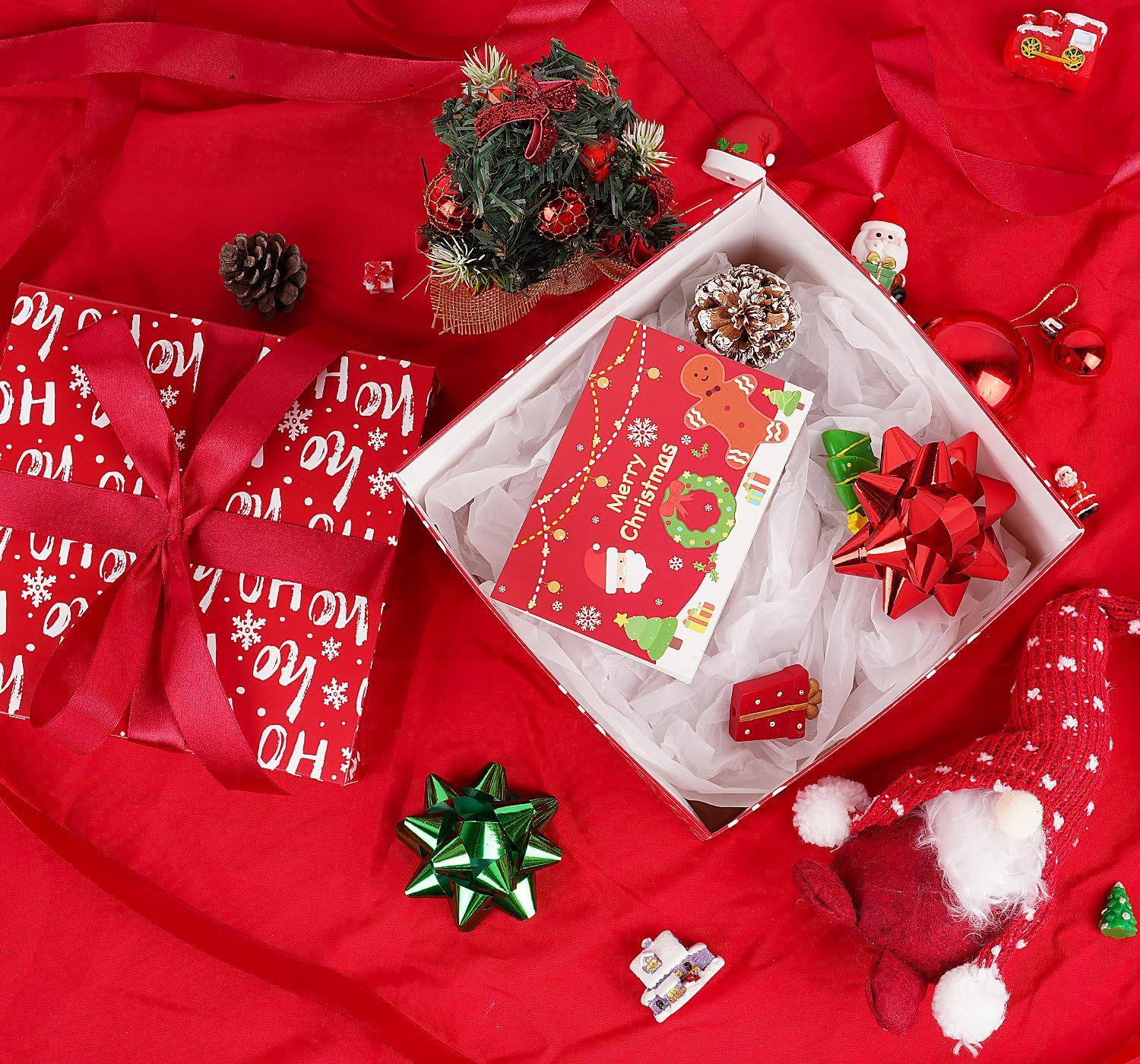 Make your Christmas gifts even more special with these Christmas Gift Boxes. This set includes 5 boxes (each measuring 7.1 x 7.1 x 7.1 inches) with matching lids, along with 5 tissue papers and 5 ribbons (each 240 cm long) to complete your gift packaging. The ribbons are long enough to tie a beautiful bow on each box, adding the perfect finishing touch. Featuring a festive winter snowflake design, these boxes have a smooth, glossy surface, making them the ideal choice for presenting your holiday gifts with elegance and holiday cheer.