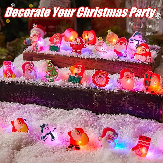 Light up your Christmas celebration with these 50 Pcs Christmas Party Favor Rings! This festive set includes 50 fun and colorful LED light rings, each featuring unique Christmas-themed designs such as Santa Claus, Christmas trees, snowflakes, reindeer, stockings, and more. The rings are perfect for adding a bit of sparkle and excitement to your holiday parties, gift exchanges, or any Christmas-themed event. Thanks to the elastic band, these rings comfortably fit any finger, and they can also be used creatively as decorations on hair, Christmas trees, tables, or even cakes. Let the LED lights shine and enhance the holiday atmosphere wherever you go!