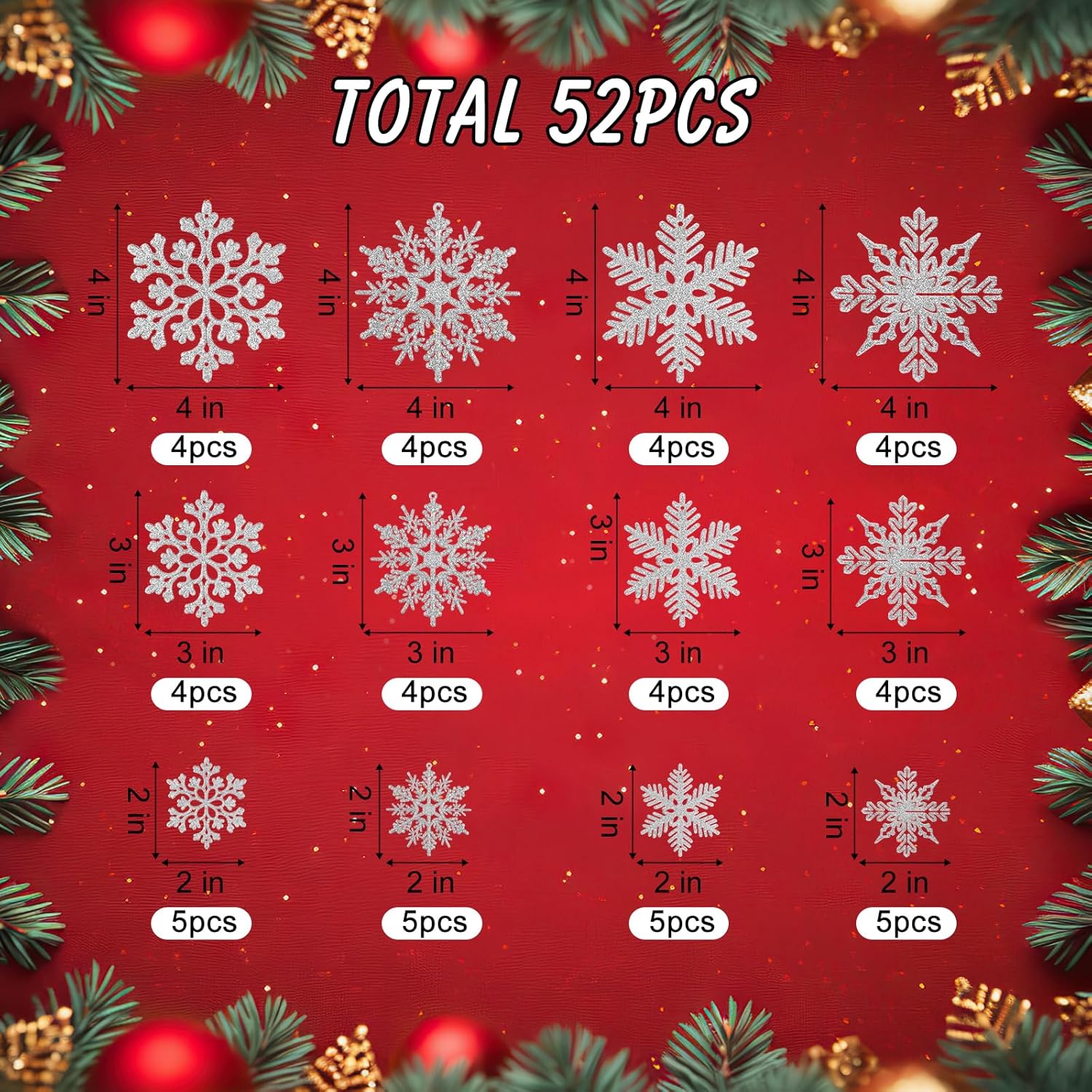 - Variety Pack of 52 Ornaments: Includes 20 snowflakes (2 inches), 16 snowflakes (3 inches), and 16 snowflakes (4 inches) for a balanced mix of sizes.