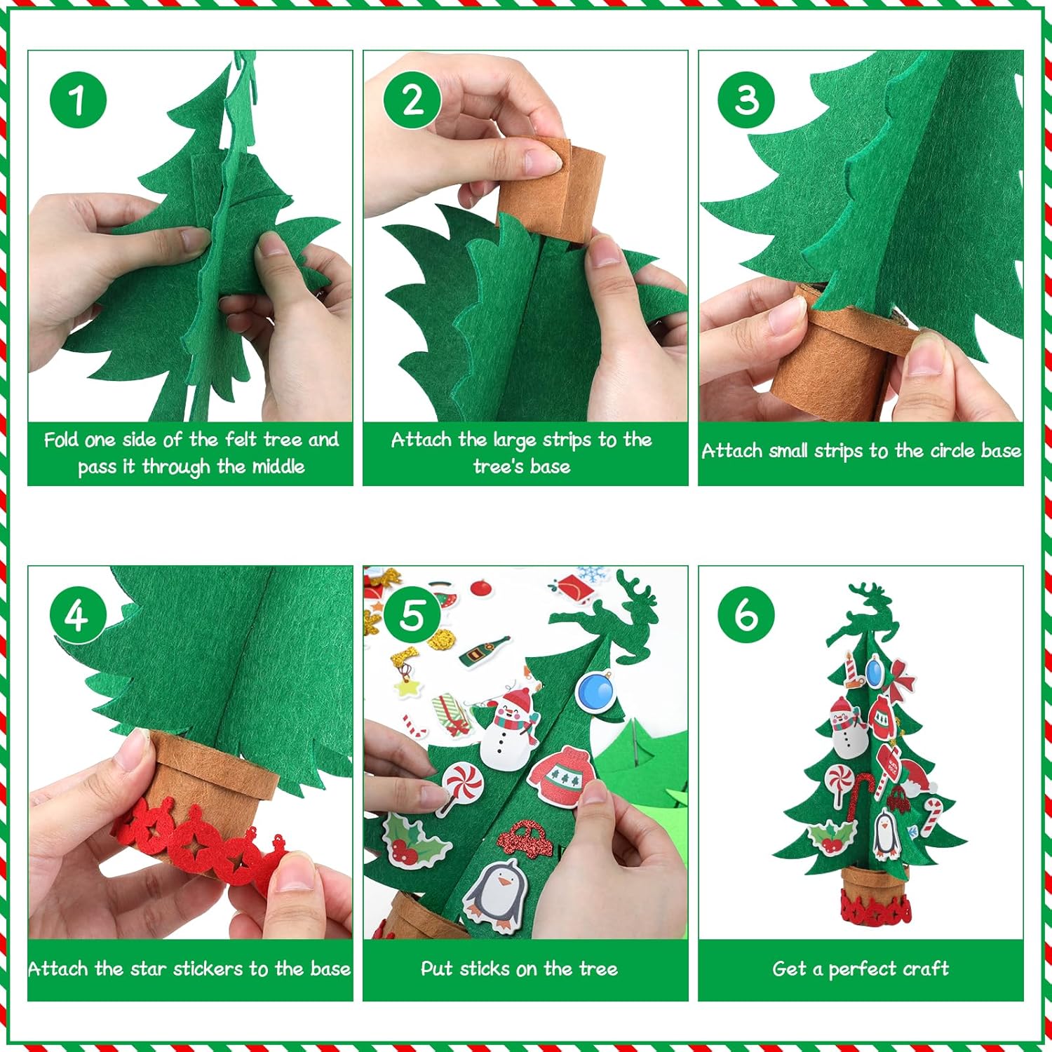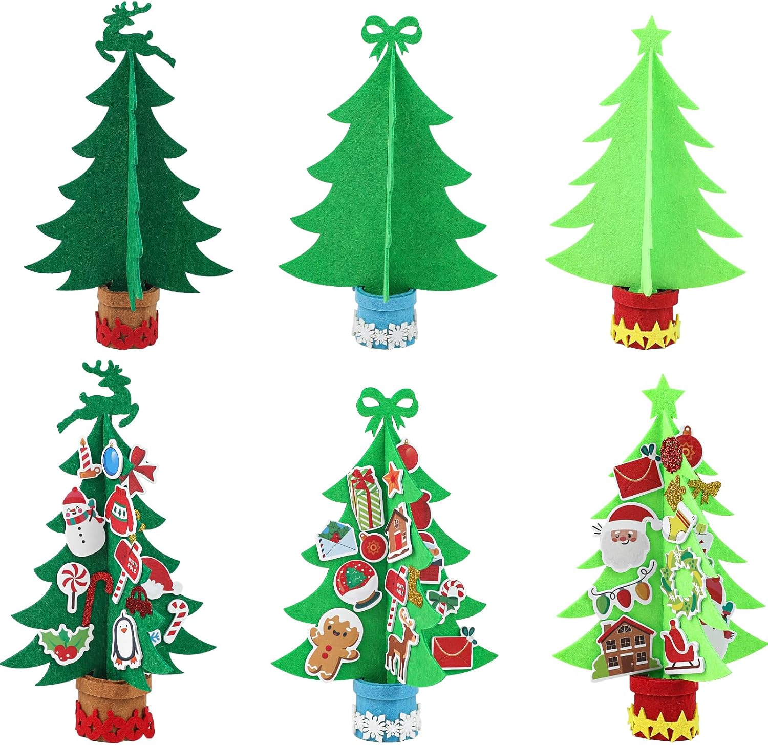 - DIY Christmas Tree Kit: Includes 6 felt Christmas trees (2 each in light green, green, and dark green), 60 colorful stickers (Christmas-themed, stars, snowflakes, and more).