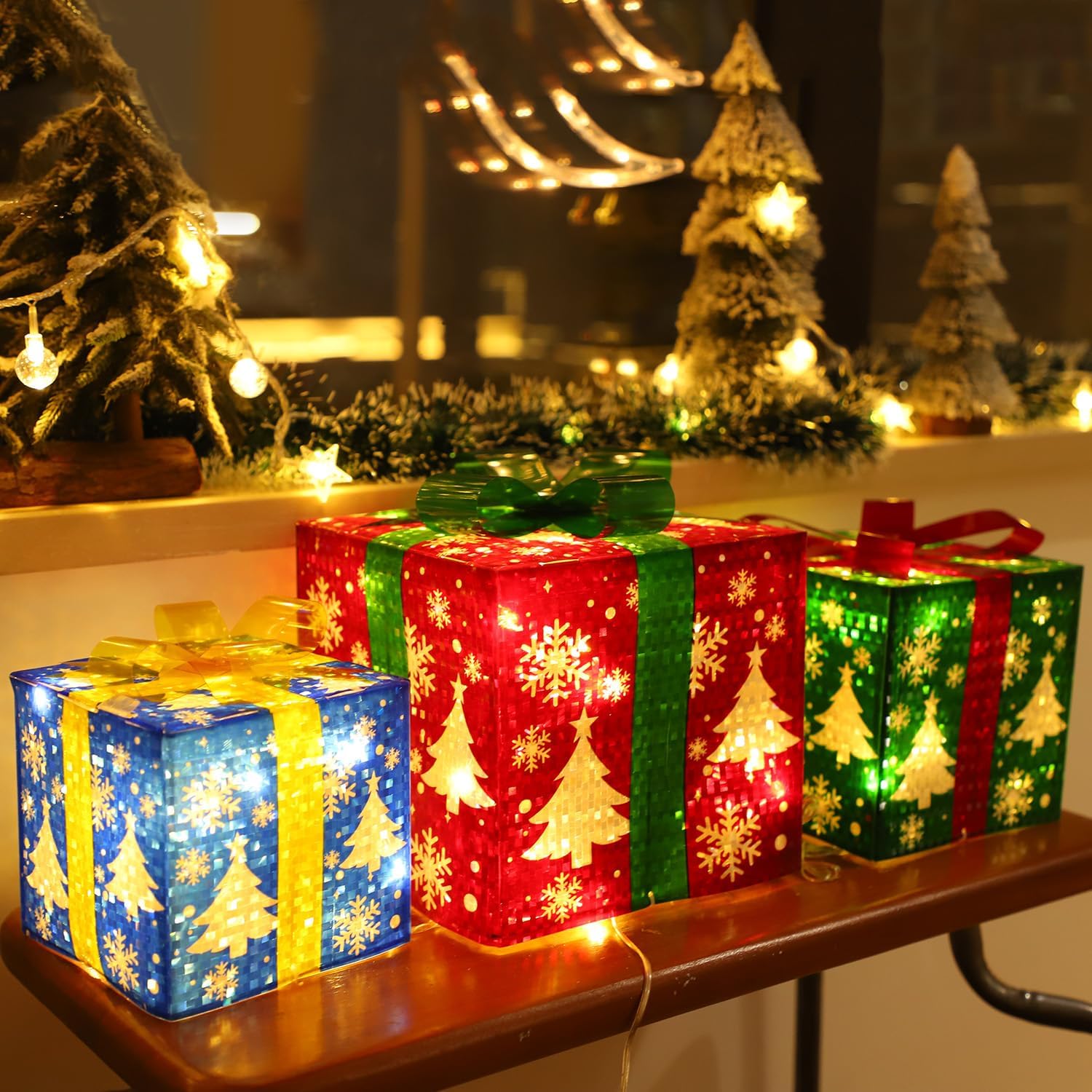 - Festive Design: 3 tinsel lighted gift boxes in red, green, and blue, each with a Christmas tree and snowflakes design.