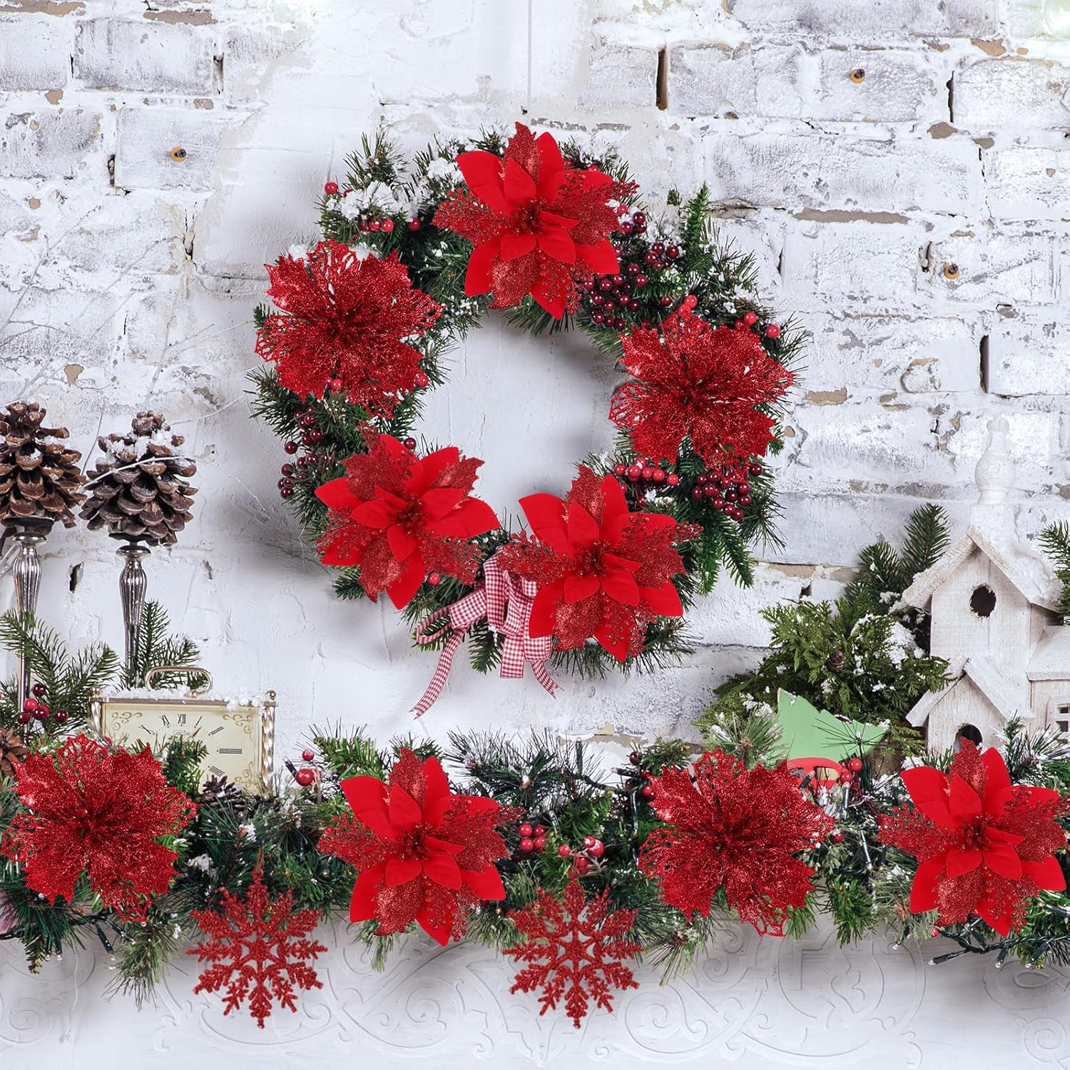 - Complete Set: Includes 18 sparkling artificial poinsettia flowers, 12 glittery berry stems, 12 rods, and 12 clips to easily attach decorations to your tree.