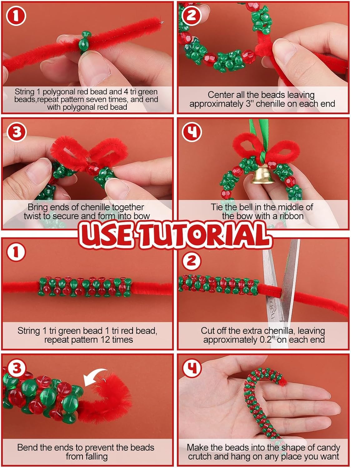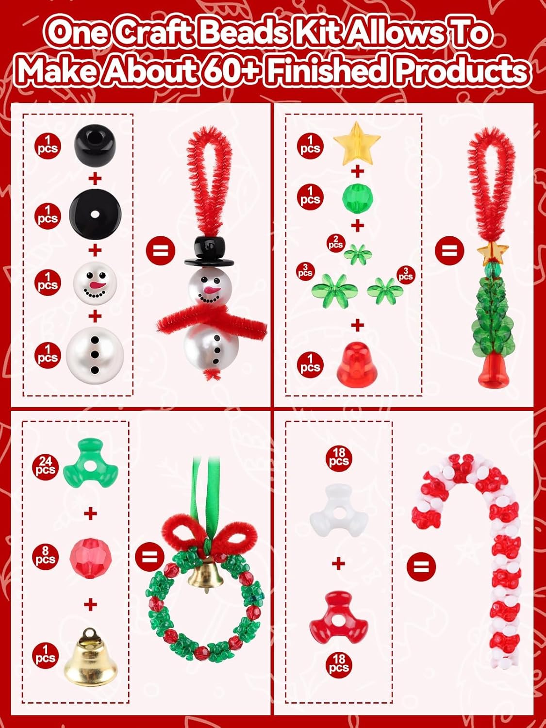 - Package Quantity: 12 yellow stars, 96 windmill beads, 12 snowman beads, 1300 tri-shaped beads, 100 red polygonal beads, 60 chenille stems (11.8 inches), 2 ribbons (196 inches), 18 golden bells