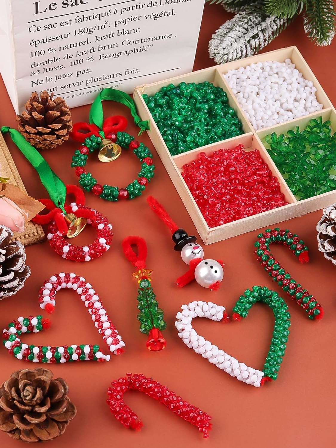 - Colorful beads in green, red, and white, perfect for festive designs