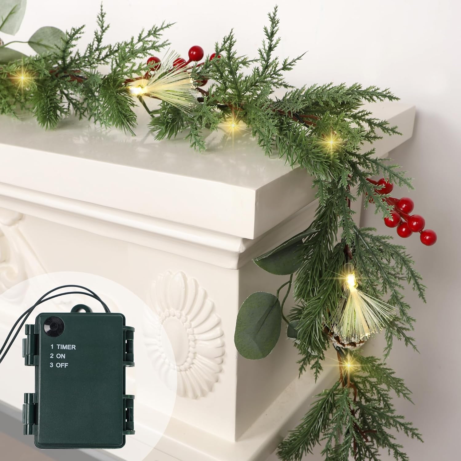 Add a touch of elegance and festive charm to your home with this stunning light-up Christmas Garland. Designed with meticulous attention to detail, it features lush green conifer branches, vibrant red berry clusters, and rustic pine cones, making it a perfect addition to any holiday decor. The soft, warm LED lights seamlessly blend into the garland, casting a gentle, inviting glow. This battery-operated garland creates a cozy, romantic atmosphere, perfect for family gatherings, peaceful moments, or simply enhancing the Christmas spirit throughout your home.