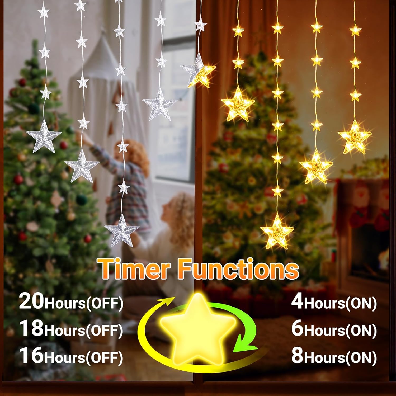 Transform your space into a winter wonderland with our breathtaking holiday star curtain lights. This elegant set includes 9 large pearl-effect stars (3.5") and 31 smaller stars (1.4"), all powered by 76 ultra-bright SMT LEDs that create a dazzling glow. Measuring over 6.5 feet in length, the lights feature cascading strands that range from 16" to 28" in drop, making them perfect for adorning windows, walls, or mantels. The symmetrical design and enchanting starry arrangement instantly infuse your home with magical Christmas charm, bringing warmth and festive cheer to any room. With 12 lighting modes and adjustable color options, you can set the perfect ambiance for every occasion, whether it's a cozy family evening or a lively holiday celebration.