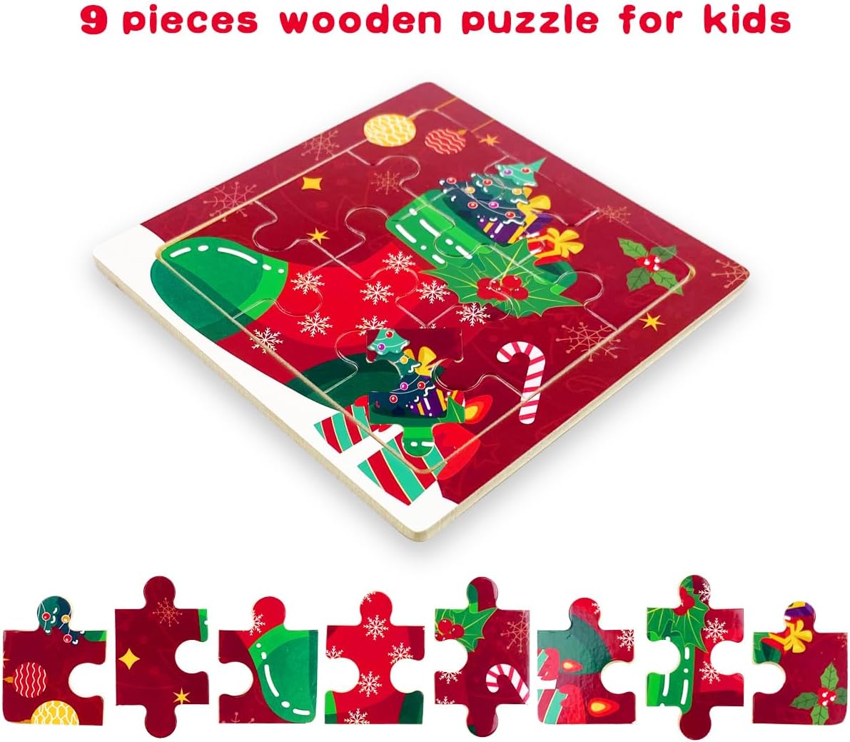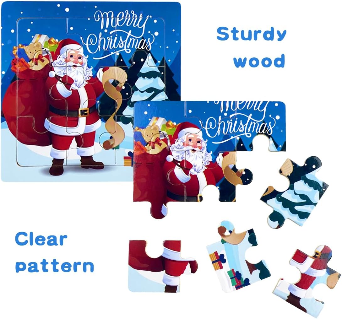 - 8 Wooden Puzzles: Includes 8 different Christmas-themed puzzles—Santa Claus, Snowman, Snowflake, Christmas Tree, Christmas Stocking, Gingerbread Man, Elk, and Bell.