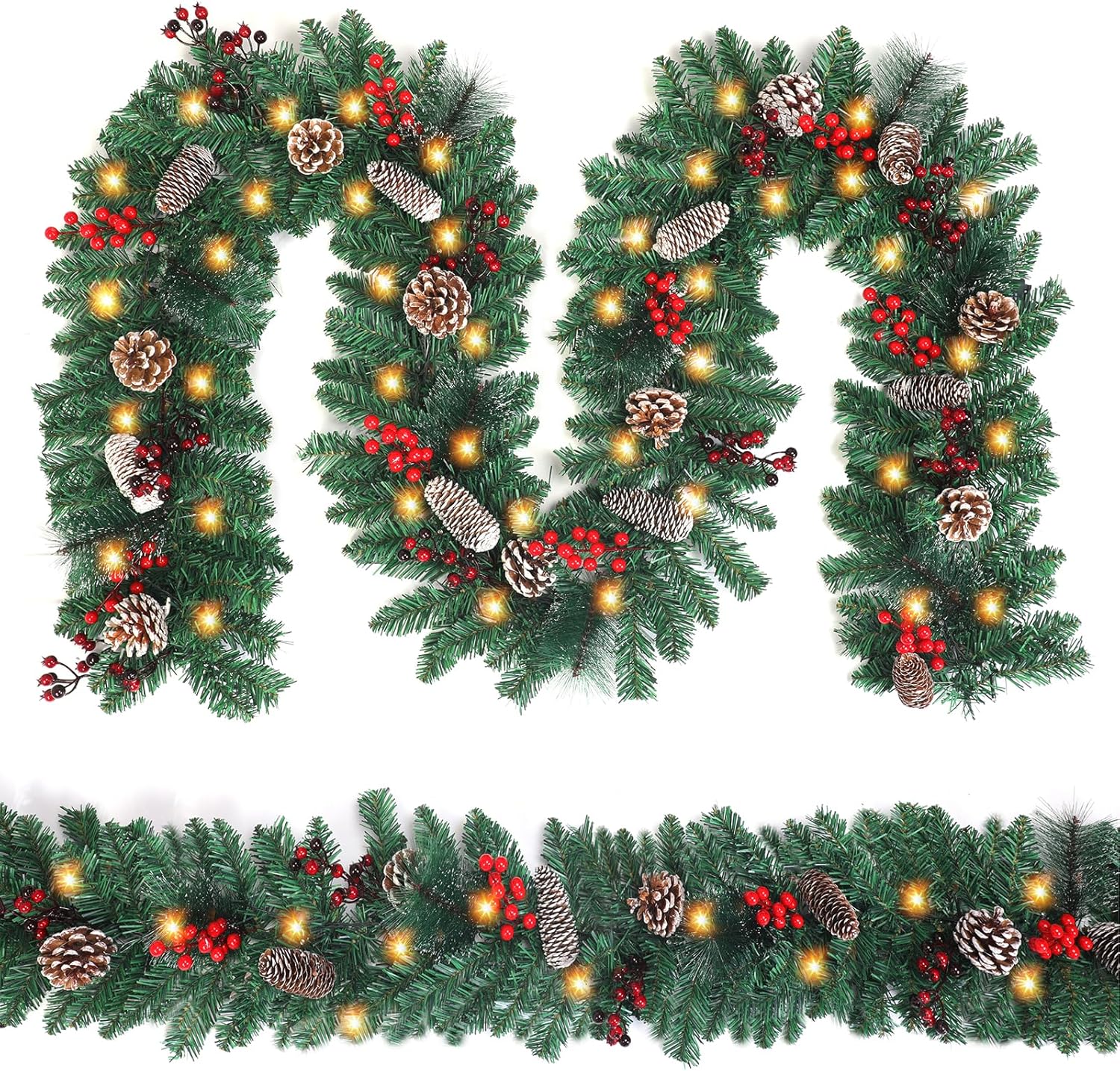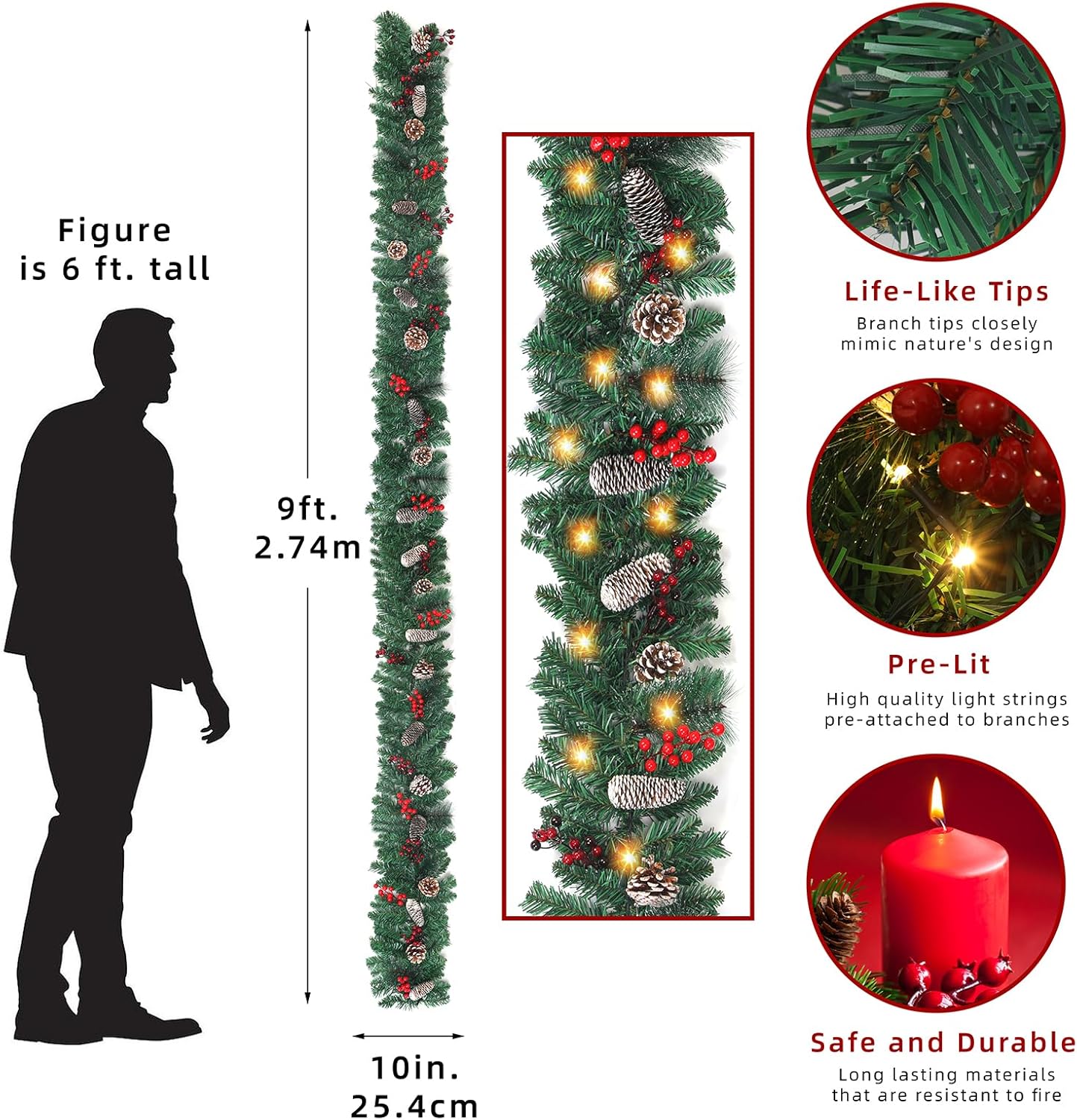 Bring festive elegance to your holiday décor with this 9-foot Christmas Garland, designed with 190 full branch tips for a lush and realistic appearance. Unlike many garlands that shed or fall apart, this premium PVC garland is reinforced with a durable copper wire frame, allowing you to shape and position it with ease. Adorned with red berry branches, frosted white pinecones, and white pine needles, it adds a charming, wintry touch to any indoor or outdoor setting—whether draped along stair railings, mantels, doorways, or wrapped around a Christmas tree.