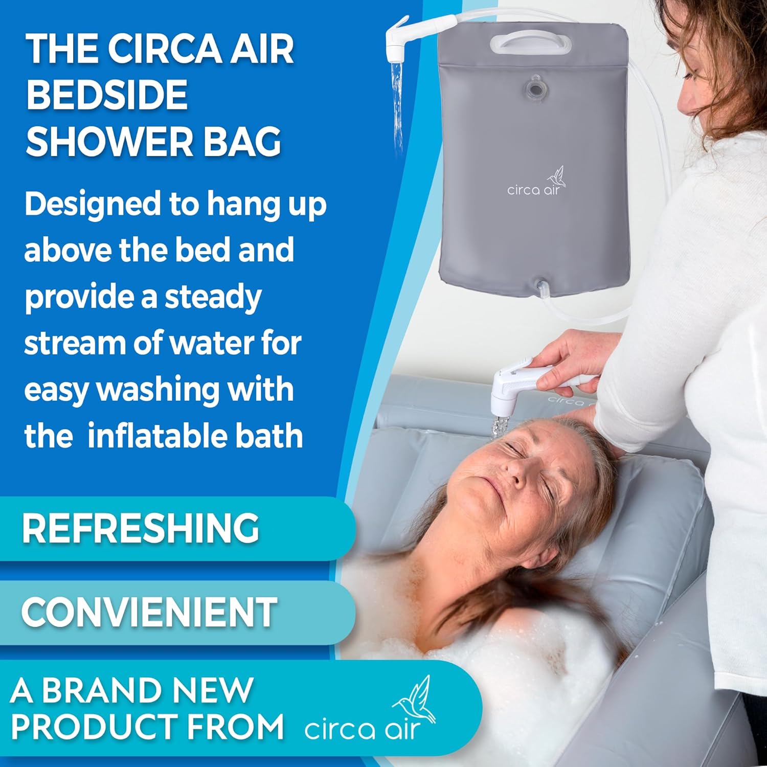 Transform bath time into a comfortable, accessible, and dignified experience with the Circa Air Inflatable Bathtub System. Designed to support caregivers and their loved ones, this portable full-body bathtub features a dual-layer inflatable design and comes with a bonus pillow for enhanced comfort and safety. The included bedside shower water bag, equipped with a handheld water control lever, holds 2.5 gallons and delivers a steady, gentle stream exactly where it’s needed. Powered by our best-selling electric air pump, the bathtub inflates quickly and easily. Lightweight and portable, this system is ideal for home use, travel, or temporary care situations, allowing users to enjoy soothing baths conveniently in their bedroom while preserving their dignity and independence.