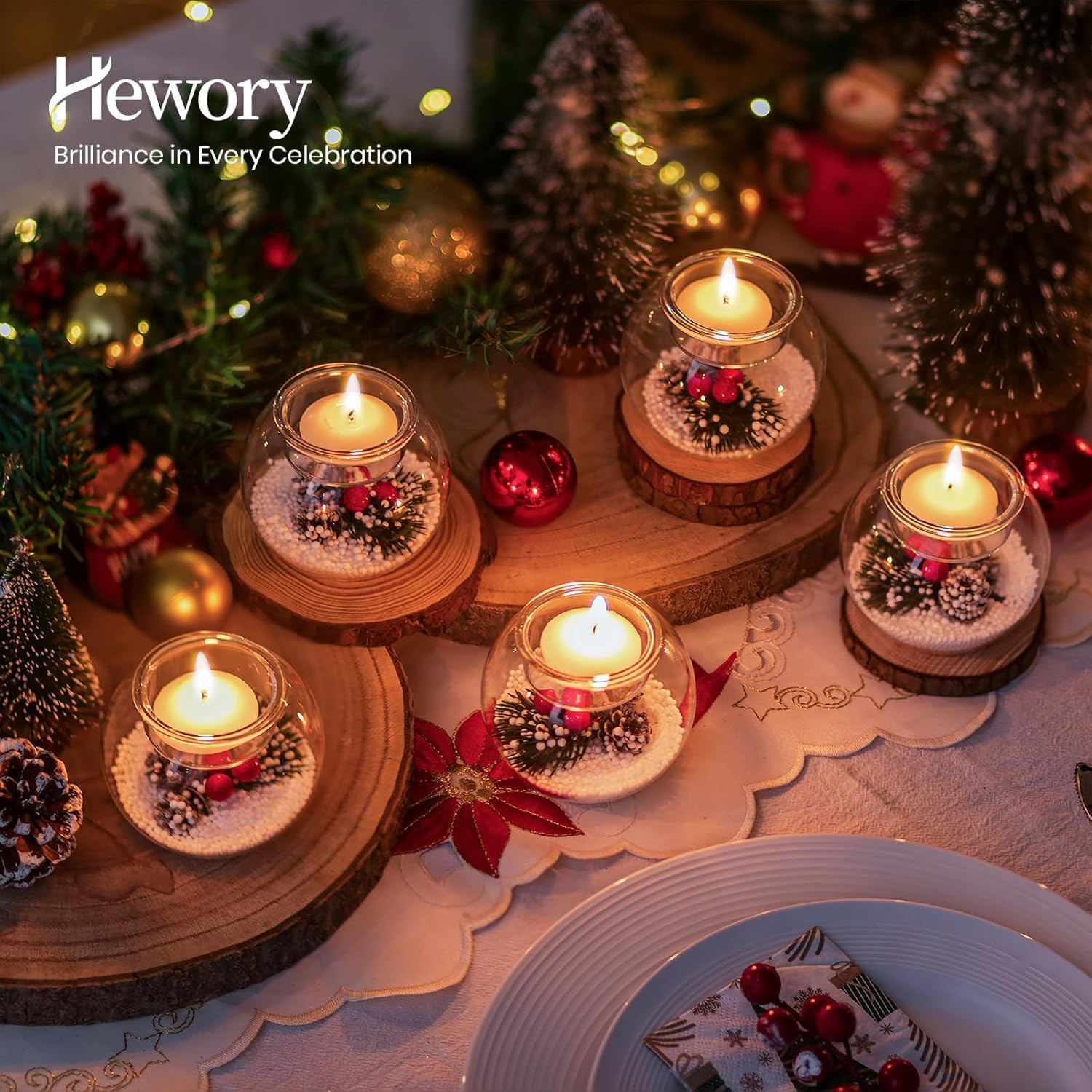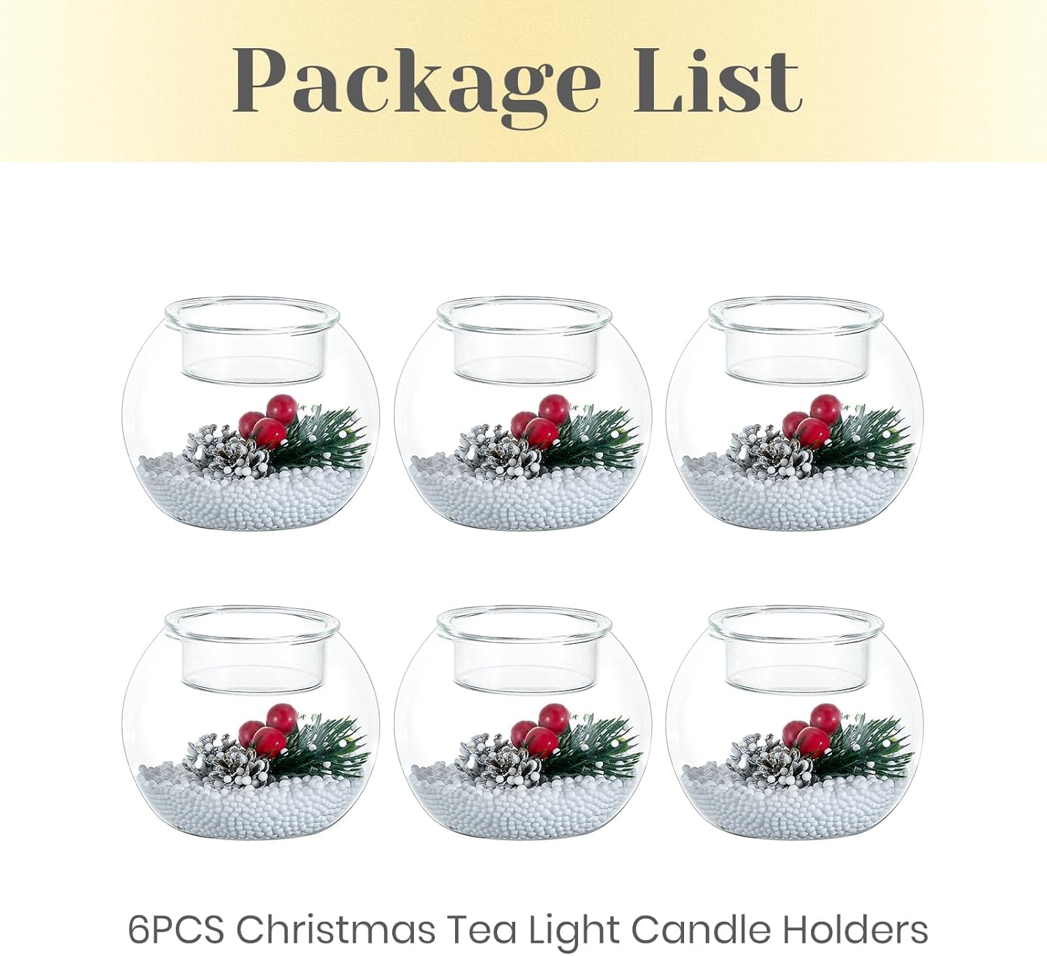 Christmas Candle Holders Set of 6 Glass Ball Holders Red Berry Pinecone Decorations