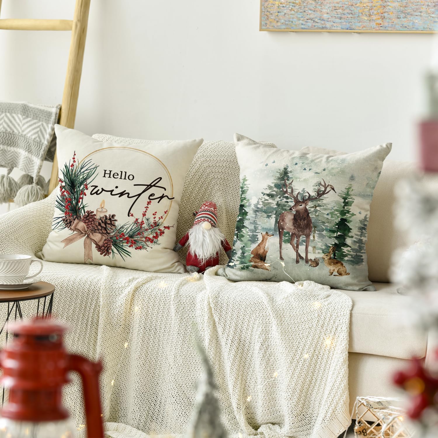 Christmas Decor Pillow Covers 18x18 – Snowflakes, Reindeer, Trees, Set of 4