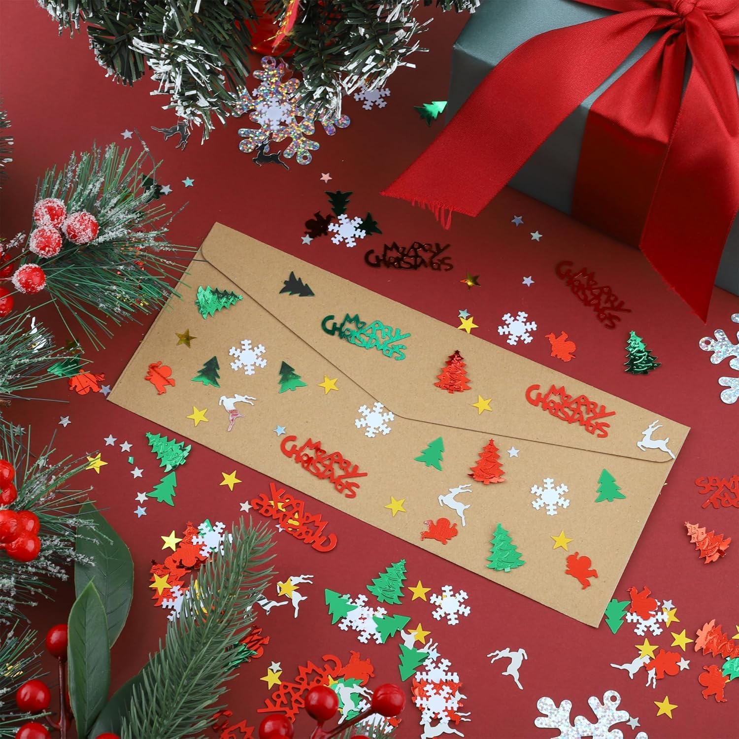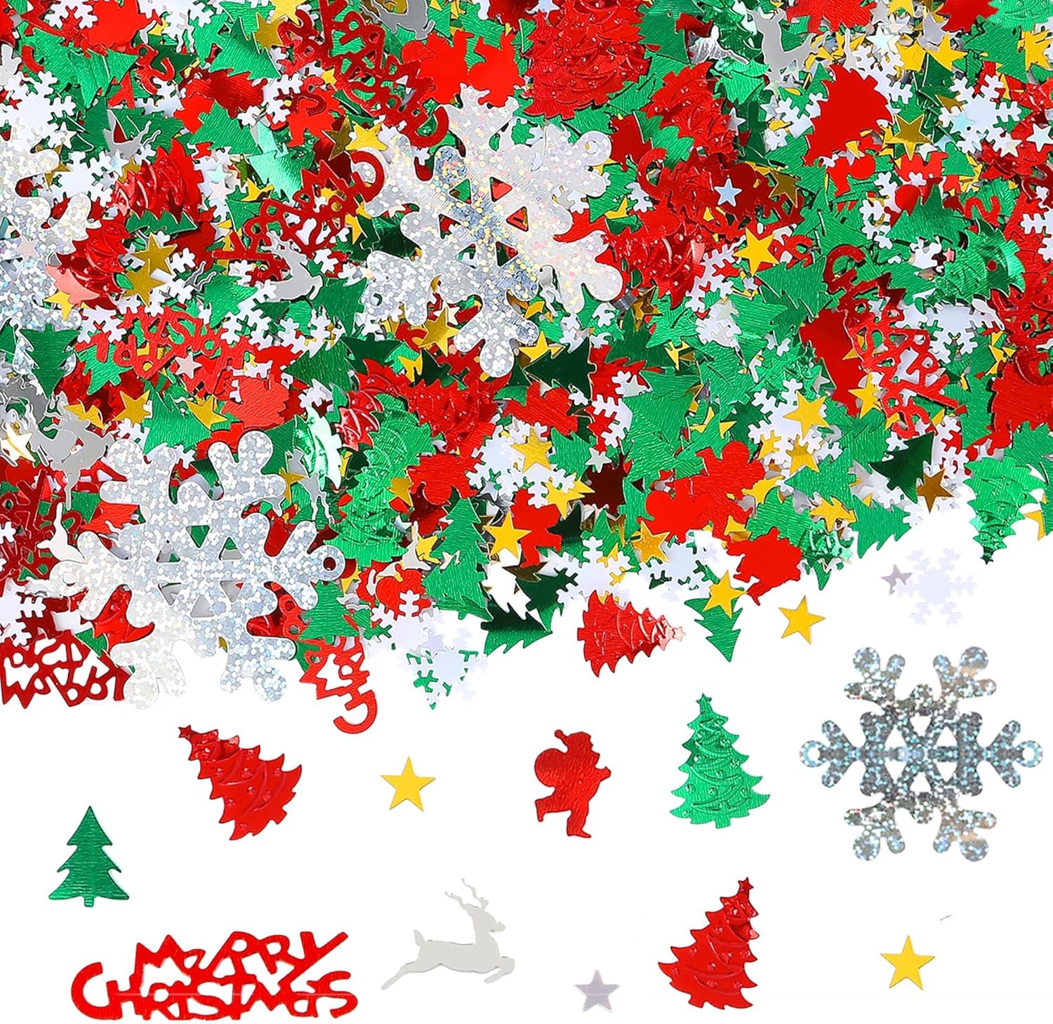 Add a festive touch to your holiday celebrations with this Christmas Confetti Set! Featuring a variety of charming designs, this confetti includes red “Merry Christmas” letters, a jolly Santa with a gift bag, beautifully decorated red and green Christmas trees, lush green pine trees, and graceful silver reindeer in mid-run. For a sparkling touch, the set also includes shimmering white and iridescent snowflakes, as well as golden and silver pentagrams. These vibrant and durable confetti pieces are perfect for decorating tables, gift wrapping, holiday crafts, or even party favors, making them a great addition to any Christmas event.