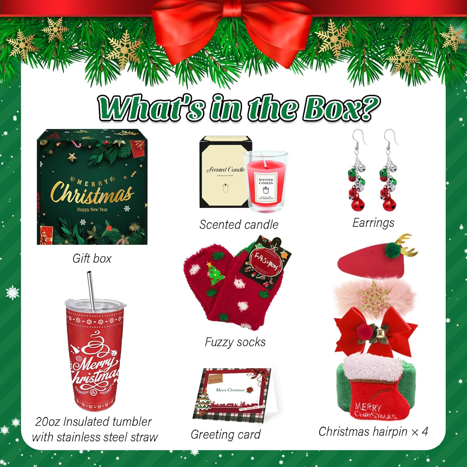 - Contents: Christmas-themed gift basket (includes red tumbler)
