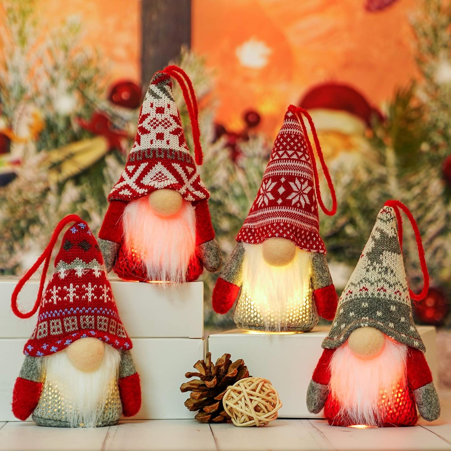 Christmas Gnome Ornaments with Lights Plush Tomte Elf 4 Pack Home Decorations