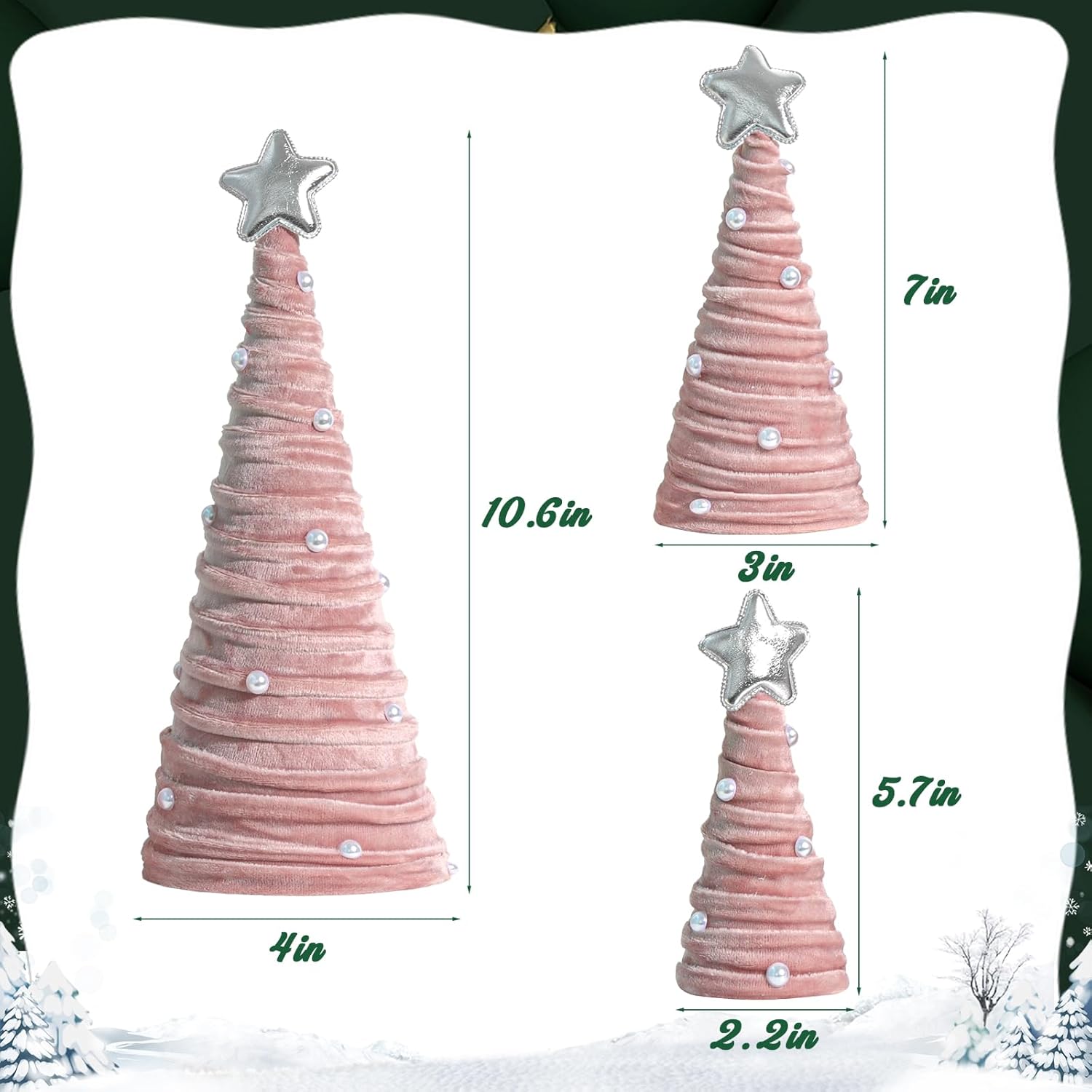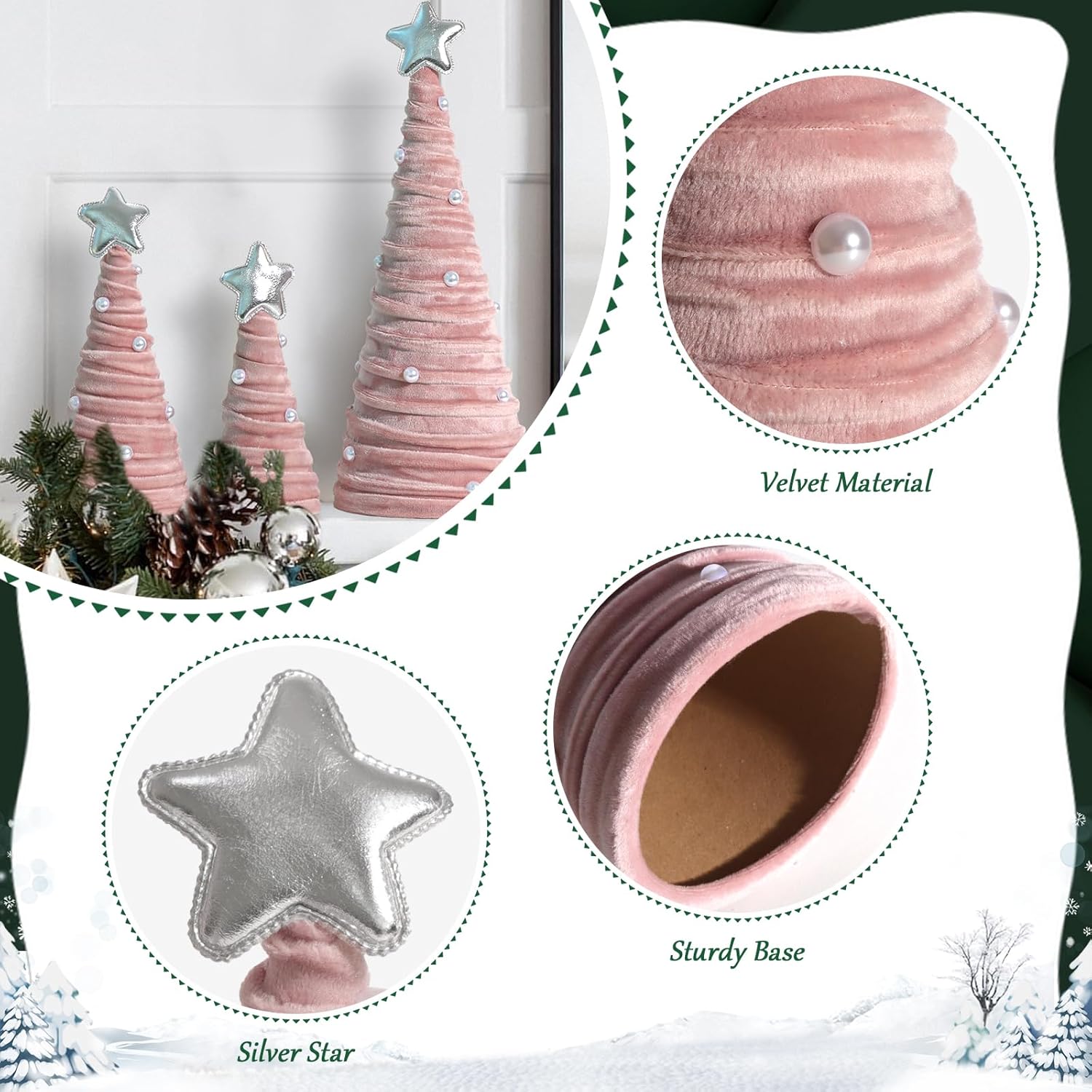 This charming 3-piece Christmas tree set is the perfect way to bring festive cheer into your home. The set includes three trees in varying sizes—large, medium, and small—allowing you to create a beautiful, layered display. Handcrafted from soft, velvety fabric in a romantic pink color, these trees exude warmth and coziness, making them an ideal addition to your home entryway, mantle, hallway, tabletop, or shelf. With their refined, dreamy design and sturdy construction, they add a touch of elegance and holiday spirit to any space.