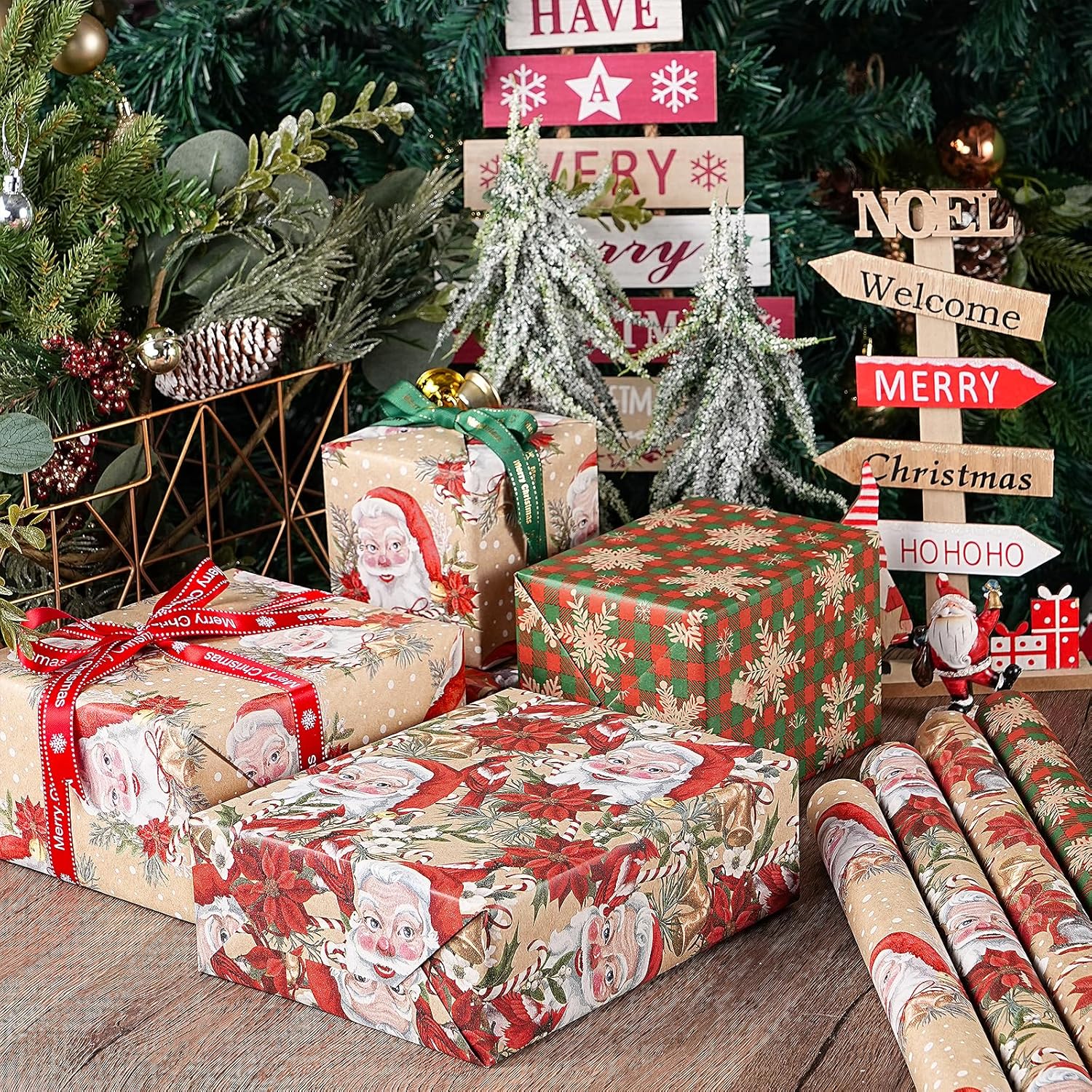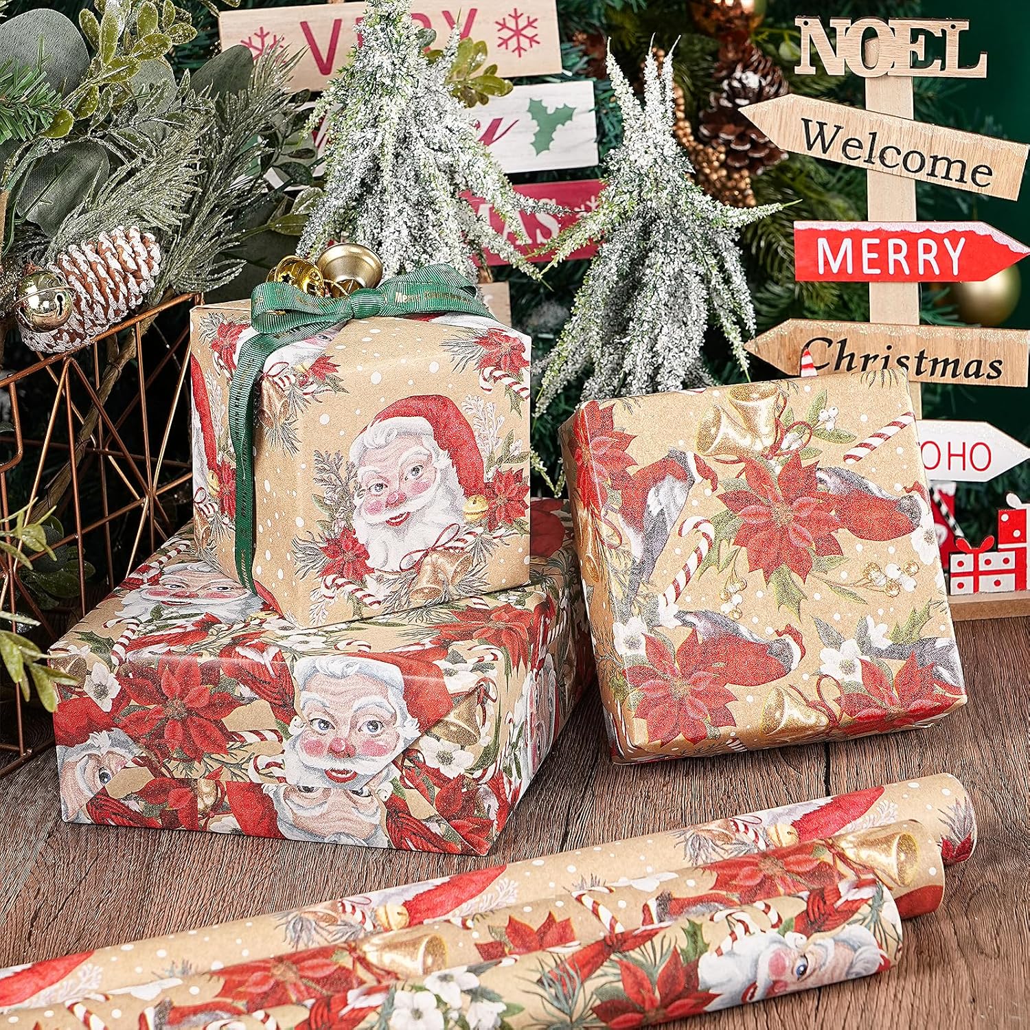 Celebrate the holiday season with this beautifully crafted rustic Christmas gift wrap set. Featuring four unique designs—including vintage Santa Claus portraits, poinsettias, festive holiday collages, and a classic red-green plaid accented with gold snowflakes—each pattern is printed on high-quality kraft paper for an authentic, timeless look. The generous roll size of 30 inches by 10 feet provides ample material to wrap multiple gifts, create charming party decorations, or complete various DIY projects. Made from durable, tear-resistant kraft paper, this wrapping paper ensures your presents look perfect without tearing or wrinkling.